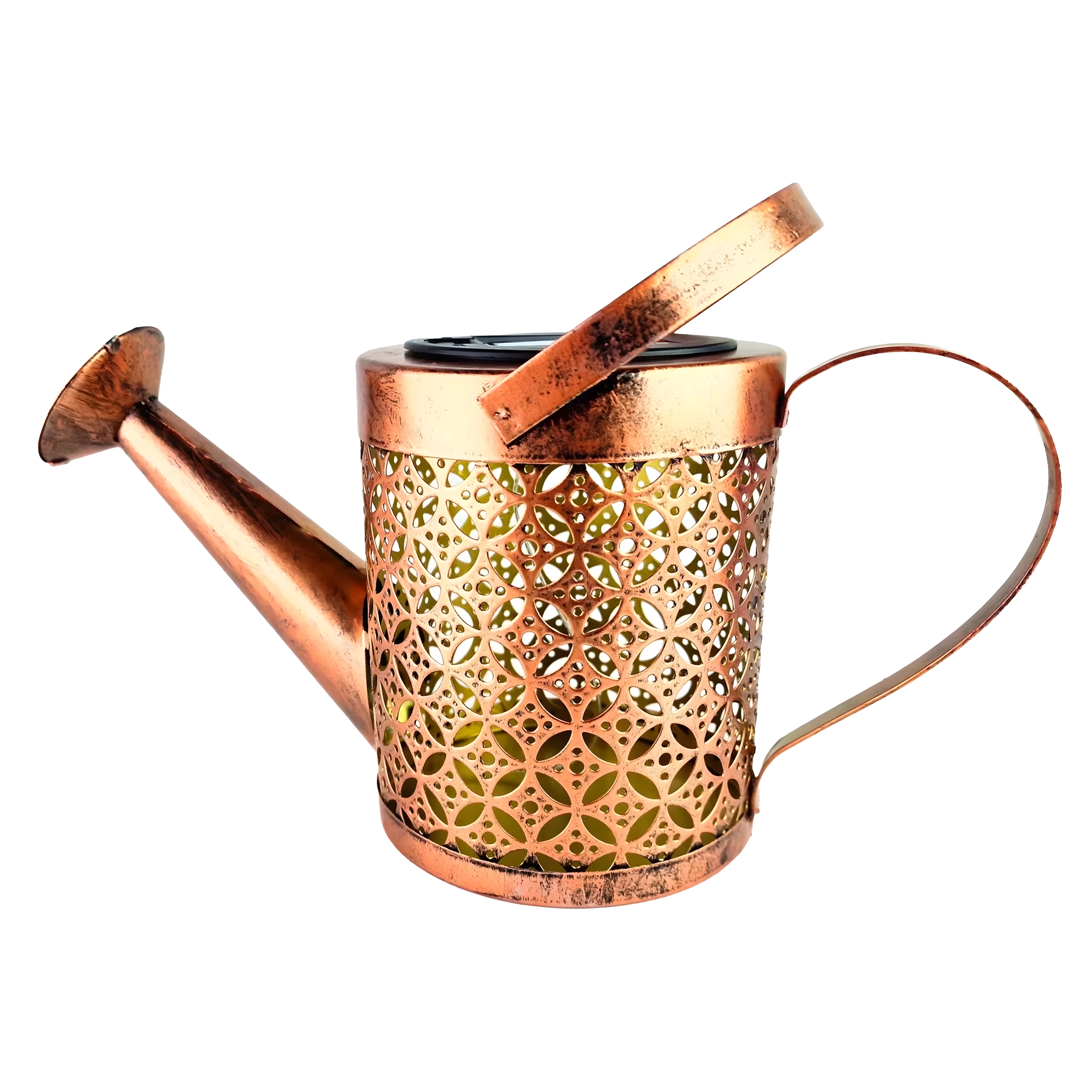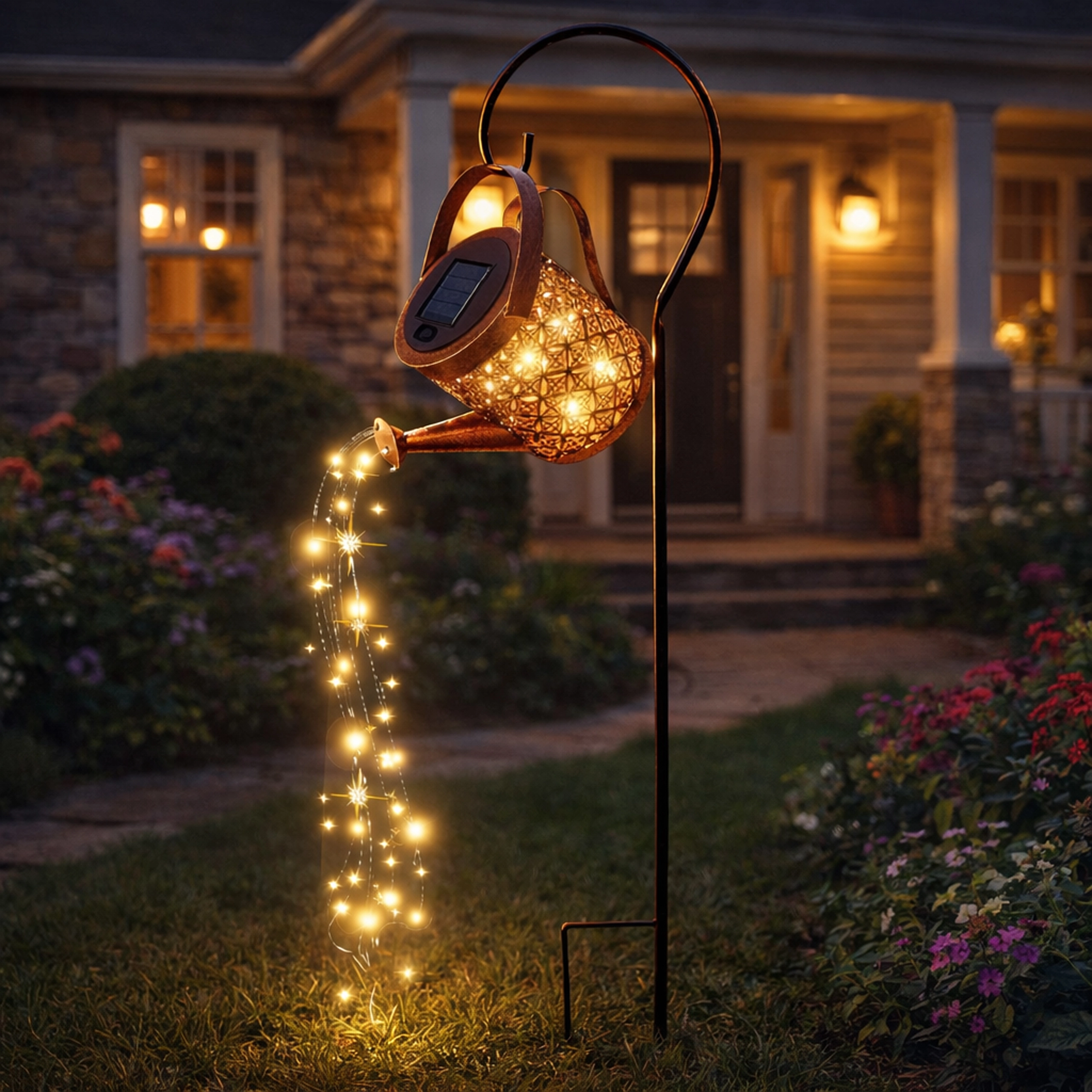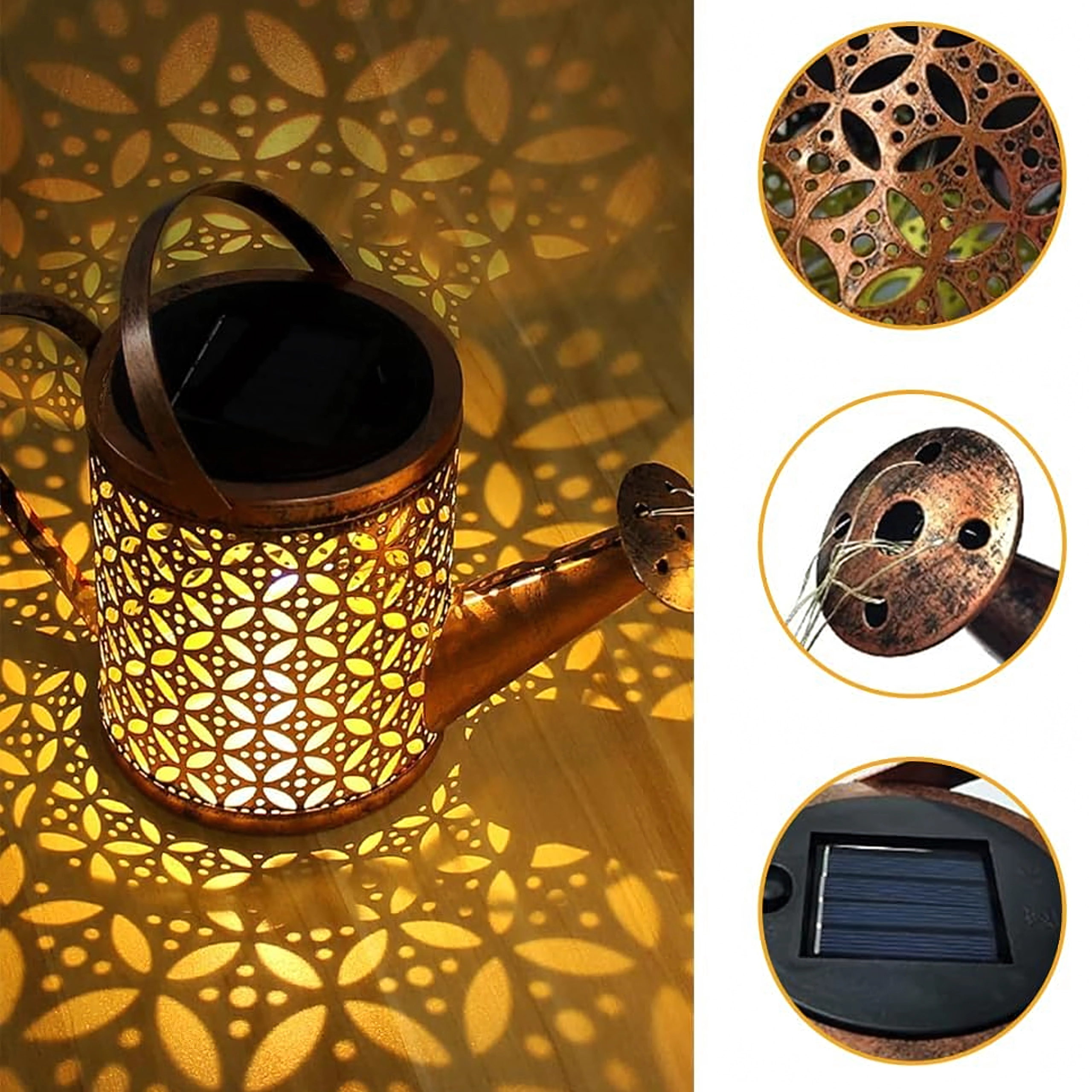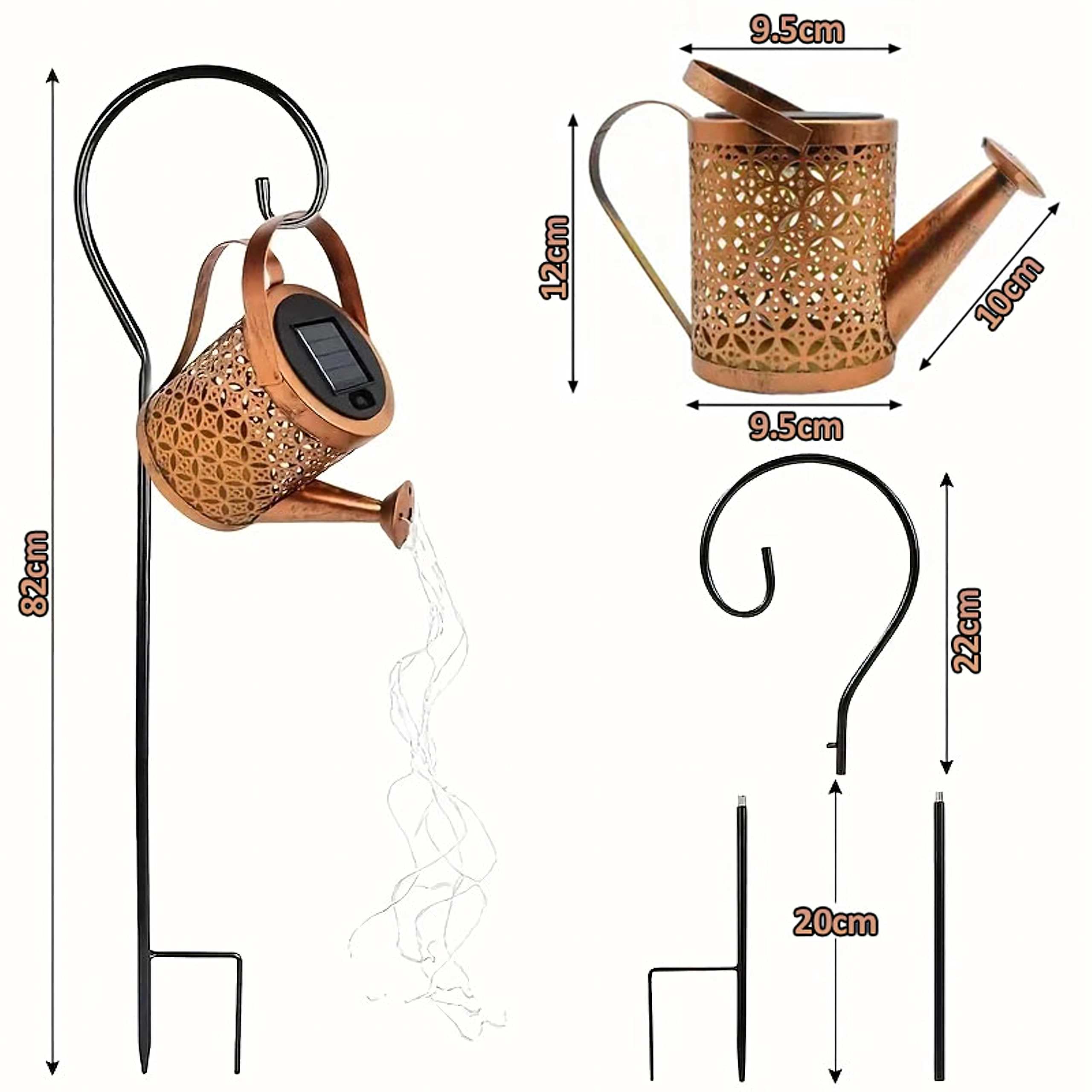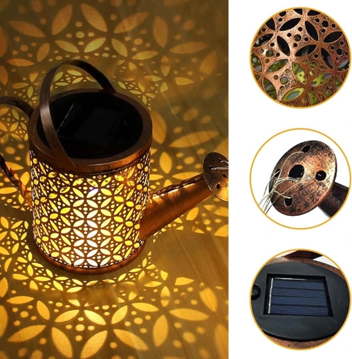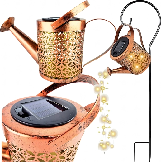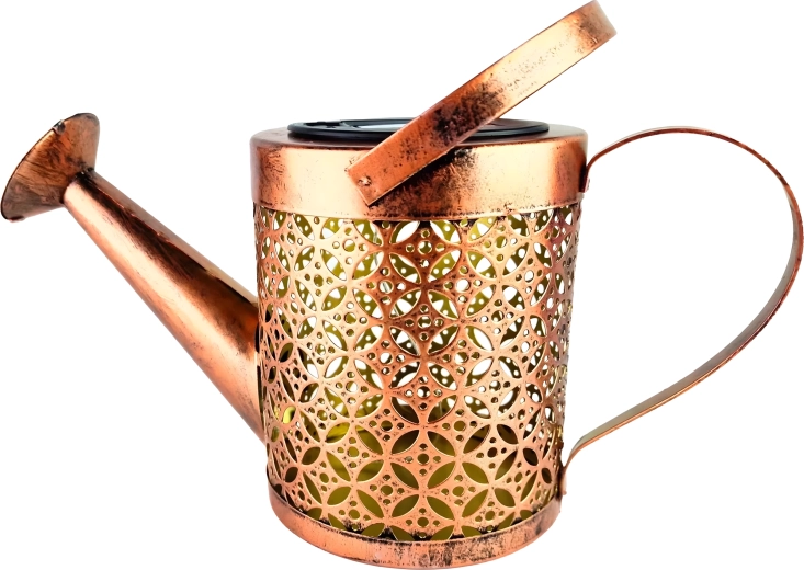 De zonne-gieter is een opvallende tuindecoratie die overdag energie uit de zon verzamelt en ’s avonds warm LED-licht laat “uitstromen” uit de tuit als een zachte lichtdouche. Het geperforeerde metalen lichaam creëert prachtige schaduwen en zorgt voor een knusse sfeer langs paden, in bloembedden en op het terras.