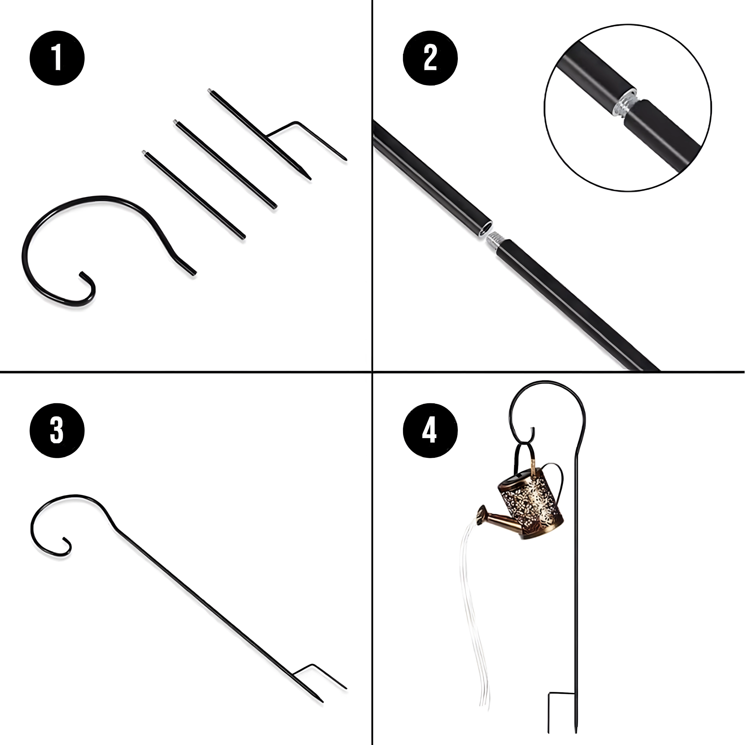 - Ophangen aan haak (shepherd’s hook) / steekstandaard voor in de grond