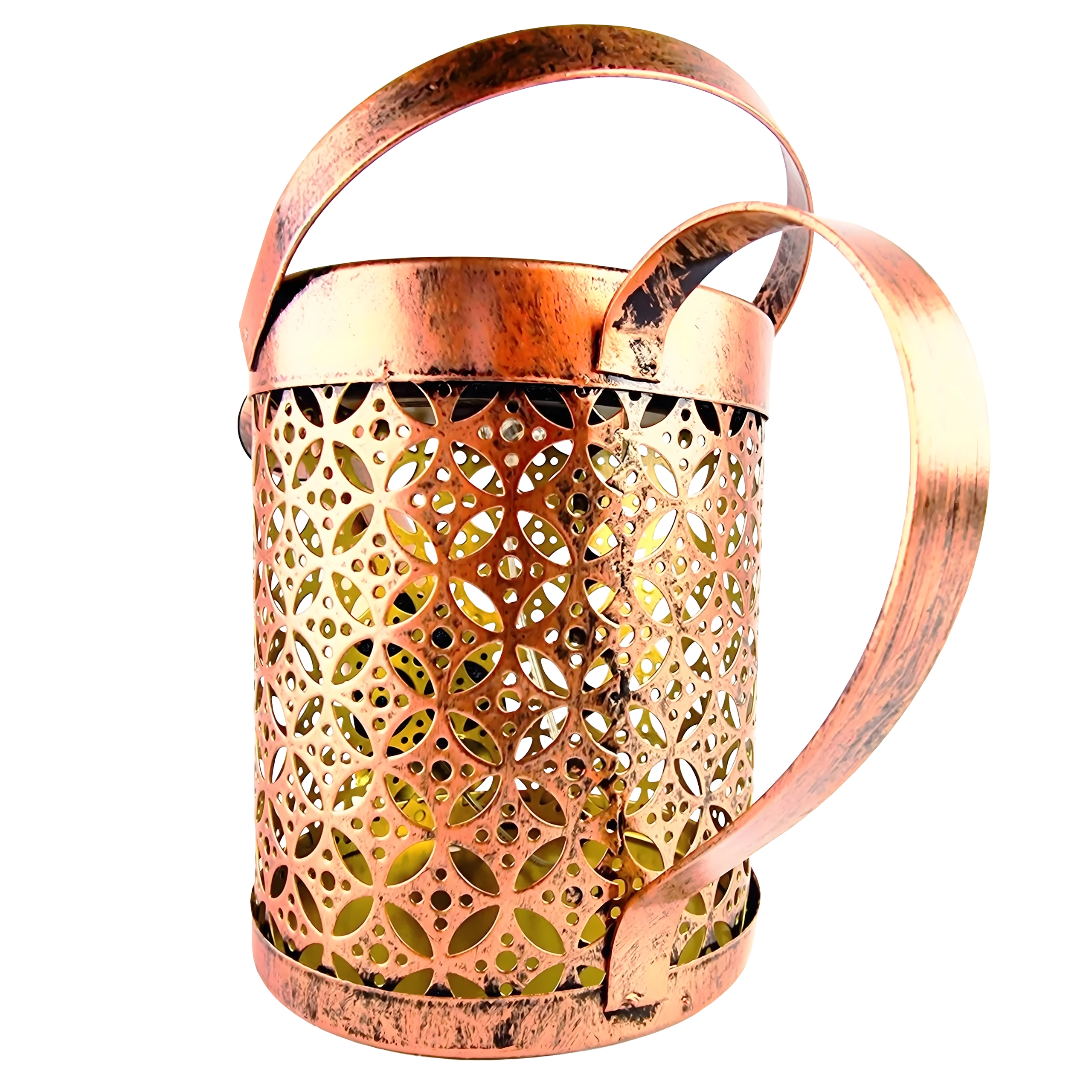 Metalen behuizing met decoratief patroon, standaard met haak en grondpin voor snelle plaatsing langs paden, in perken en bij terrassen.