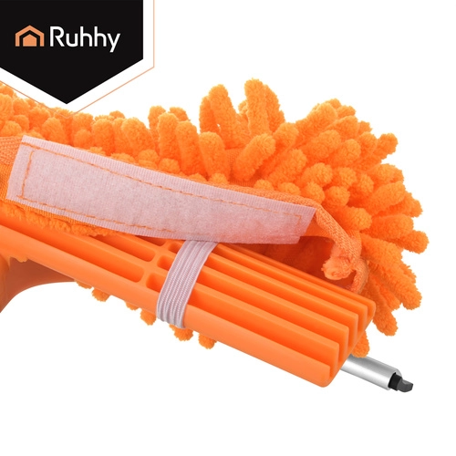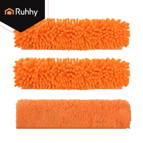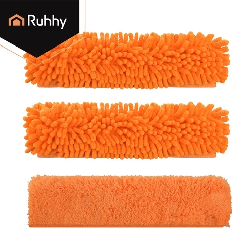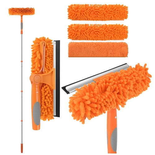 De dubbelzijdige kop combineert een absorberende microvezel voor het wassen en een rubberen trekker voor snel waterafvoeren zonder strepen. Drie verwisselbare hoezen (2× chenille, 1× glad coral velvet) verbeteren de reinigingsefficiëntie afhankelijk van het type vuil en zijn wasbaar en herbruikbaar.