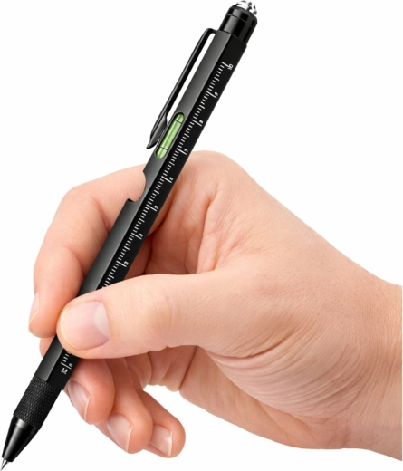 De zwarte pen combineert een LED-lamp, waterpas, liniaal, stylus, flesopener, telefoonhouder en schroevendraaiers (plat/kruiskop). Ideaal voor snelle aanpassingen, meten en notities.