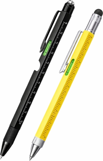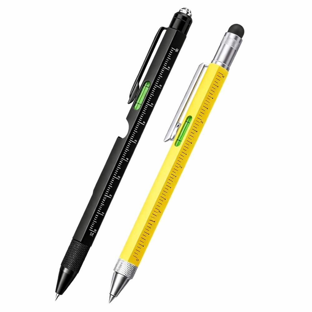 Bespaar ruimte en tijd met een universele set die schrijven, meten en snelle kleine reparaties combineert. De zwarte 9-in-1 pen is uitgerust met een LED-zaklamp voor werken onder minder ideale omstandigheden, een geïntegreerde waterpas voor uitlijning, een geprinte schaalverdeling, stylus, flesopener, telefoonhouder en twee schroefbits (plat/kruiskop). De gele pen vult de meest gebruikte functies aan – stylus, liniaal en schroevendraaier – in een duurzame metalen behuizing met zekere grip.