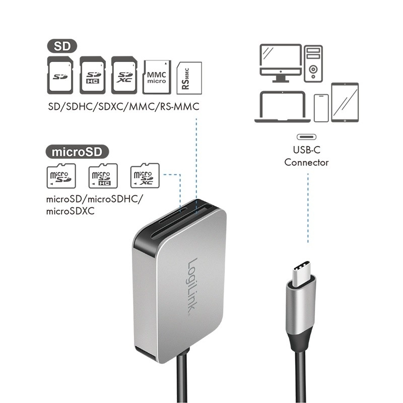 Compacte kaartlezer met USB‑C‑connector biedt snelle gegevensoverdracht tot 5 Gbit/s en een betrouwbare verbinding met laptop, tablet en telefoon. Ondersteunt SD, SDHC, SDXC, microSD evenals MMC en RS‑MMC met een capaciteit tot 1 TB – ideaal voor fotografen, contentmakers en dagelijks gebruik.