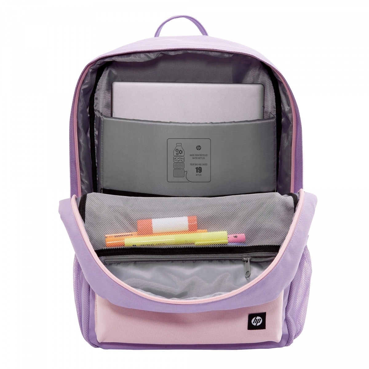 Stijlvolle en praktische HP Campus-rugzak in lavendelkleur met veilige opslag voor een 15,6" laptop, doordachte indeling en duurzame, waterafstotende materialen. Dankzij de afsluitbare dubbelzijdige rits, gewatteerde rug en schouderbanden en een inhoud van 17 l is hij ideaal voor school, kantoor en op reis.
