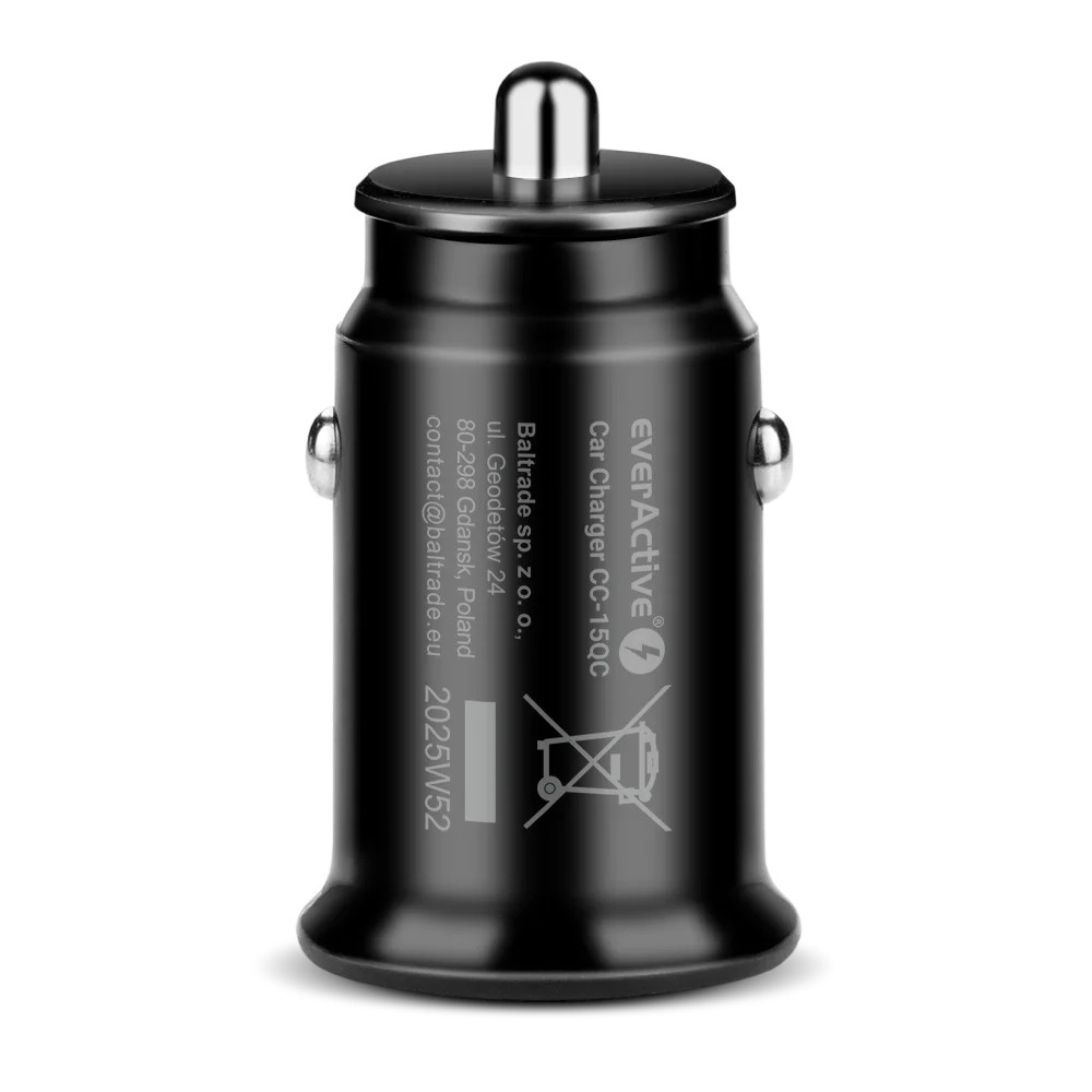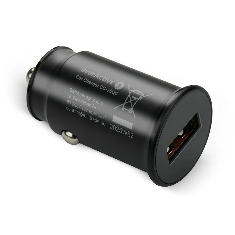 Compacte everActive autolader met één USB‑A‑poort en Quick Charge 3.0 technologie biedt snel en stabiel opladen met een vermogen tot 18 W. Dankzij de brede compatibiliteit past de slimme elektronica zich automatisch aan je telefoon, navigatie en andere mobiele apparaten aan – ideaal voor elke rit.
