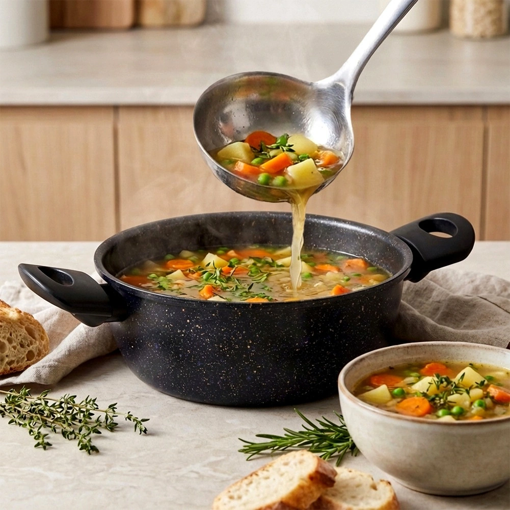 De universele pan uit de Basic Line is gemaakt van stevig koolstofstaal en voorzien van een antiaanbak granietcoating voor eenvoudig uitnemen van gerechten en snelle reiniging. Ideaal voor dagelijks koken, stoven en opwarmen van soepen, sauzen, groenten en hoofdgerechten.