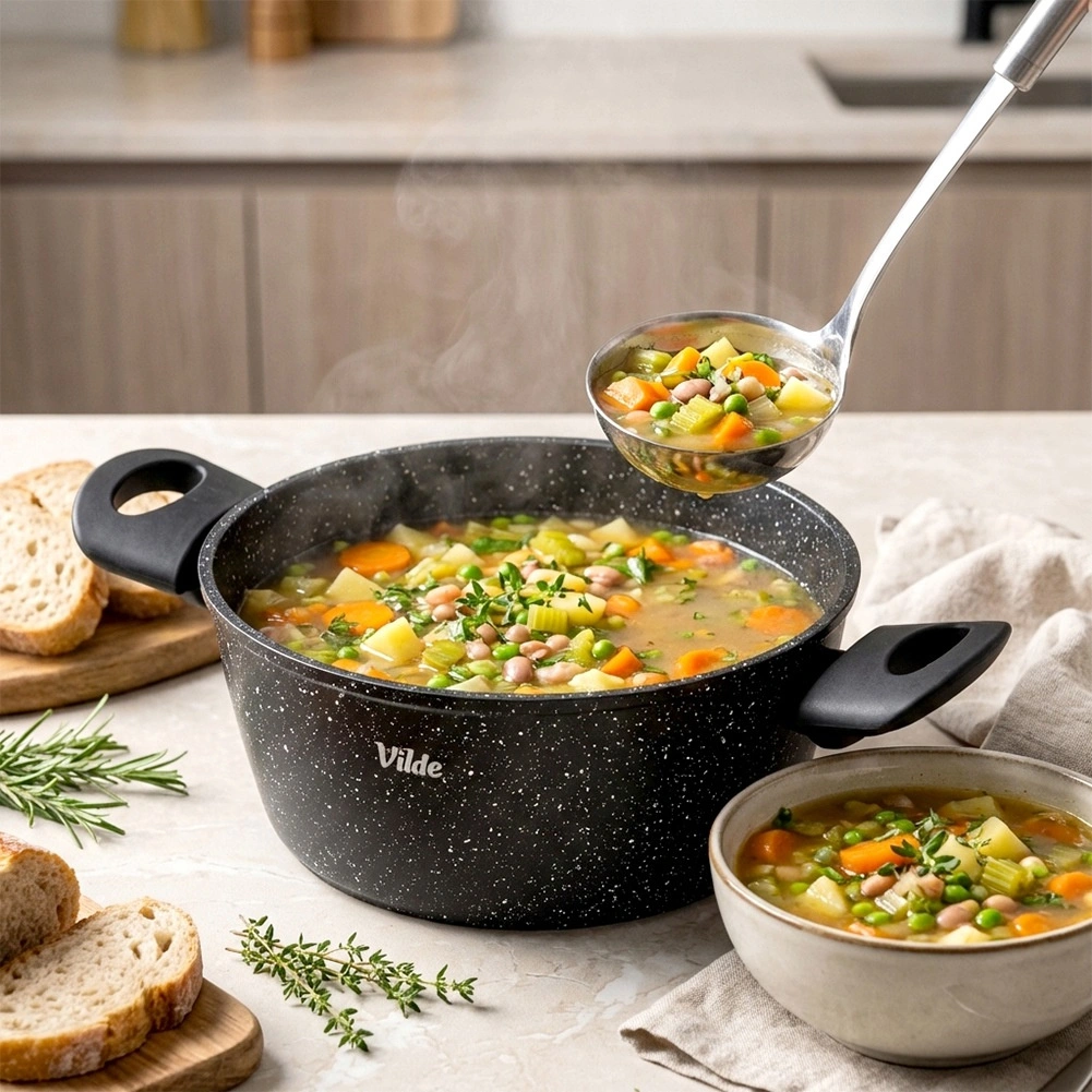De pan is een uitstekende keuze voor soepen, sauzen en stoofgerechten. De meerlaagse bodem met inductieschijf zorgt voor een gelijkmatige warmteverdeling en snelle reactie op temperatuurschommelingen, zodat u tijd en energie bespaart. Eenvoudig onderhoud en de mogelijkheid tot reinigen in de vaatwasser maken het dagelijks gebruik in de keuken makkelijker.