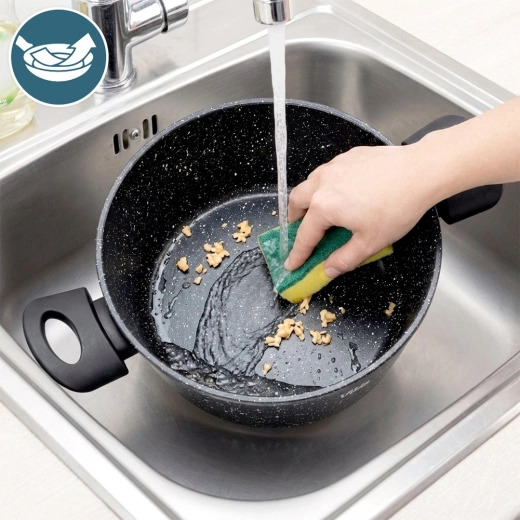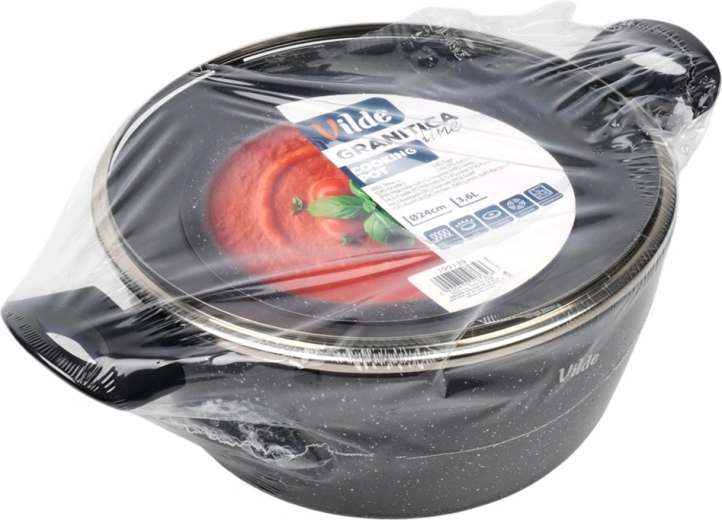 Elegante granieten pan met een diameter van 24 cm en een inhoud van 3,6 l, ideaal voor dagelijks koken van soepen, sauzen en stoofgerechten. De drievoudige anti-aanbak granieten laag zorgt voor een gelijkmatige warmteverdeling en gemakkelijk loskomen van gerechten zonder aan te bakken – voor smakelijker en gezonder koken met een minimum aan olie.