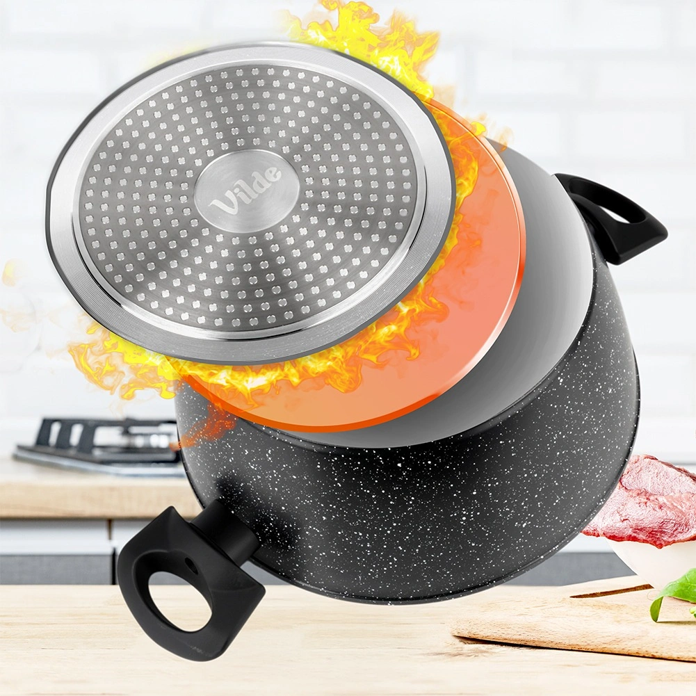 De meerlaagse bodem met inductieplaat zorgt voor efficiënte en gelijkmatige verhitting op alle soorten kookplaten, inclusief inductie.