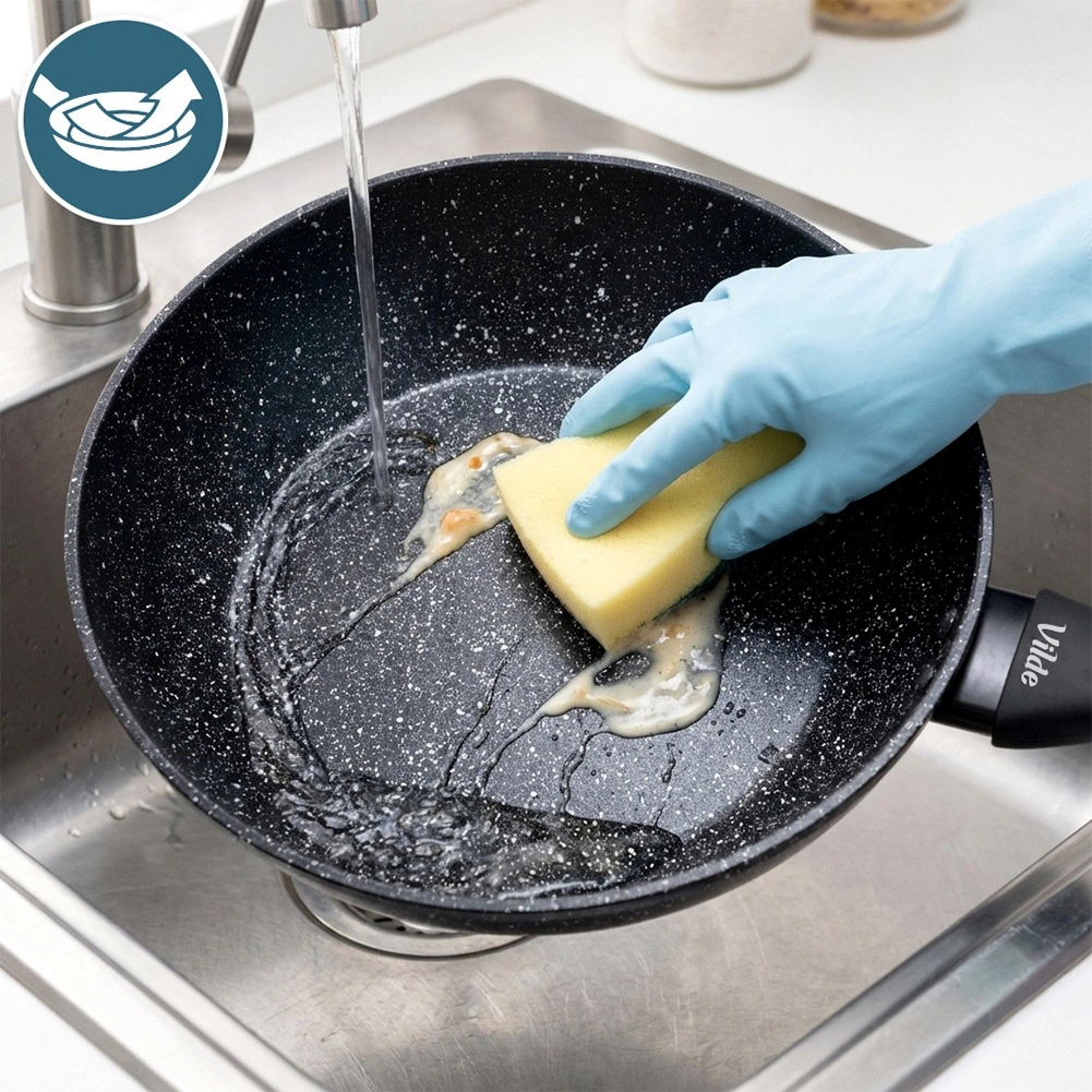 Gerechten bakken niet aan en glijden gemakkelijk over het oppervlak – bak met een minimum aan olie en reinig zonder schrobben.