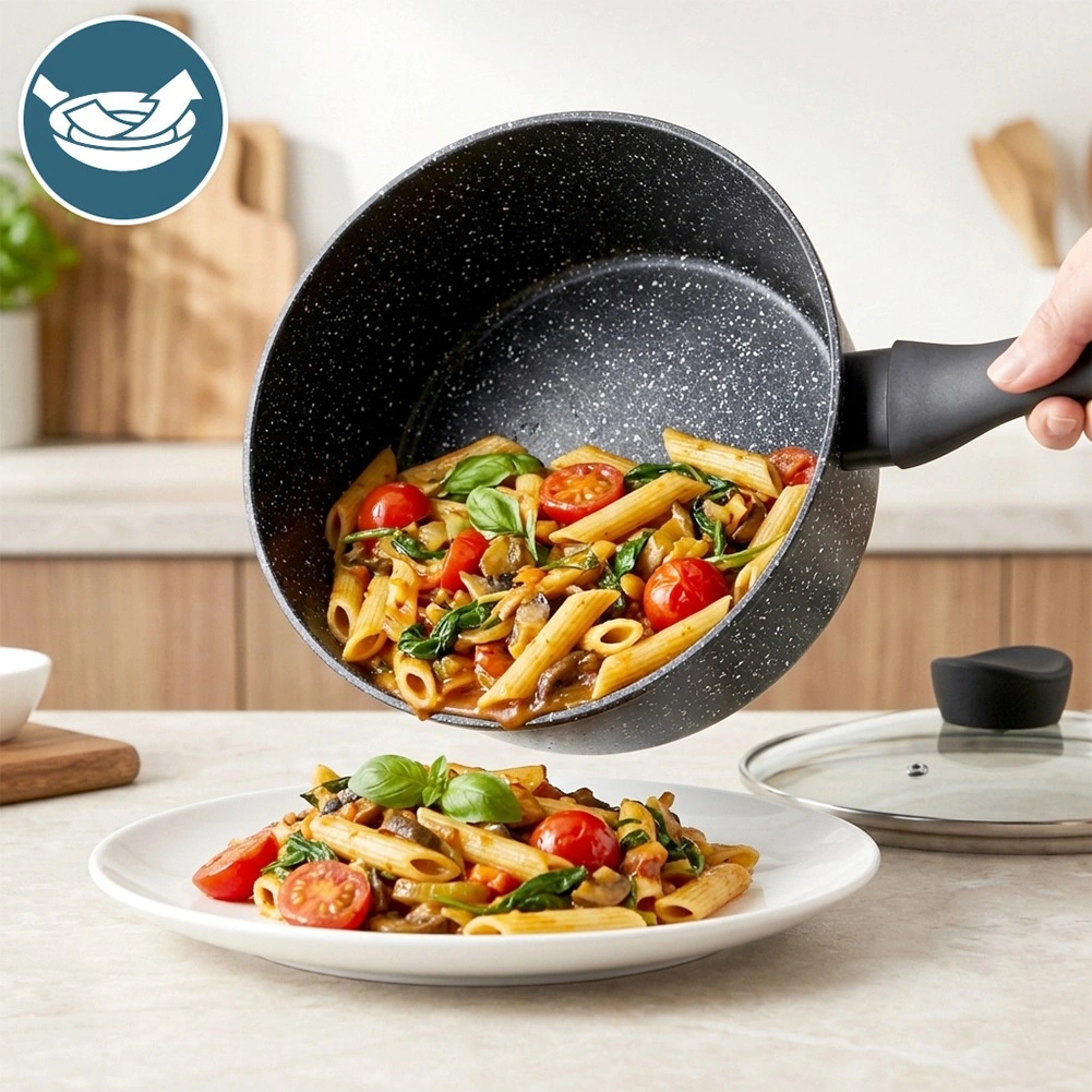 De meerlaagse granieten afwerking minimaliseert aanbakken en maakt koken met minder vet mogelijk. Reiniging is snel en moeiteloos.