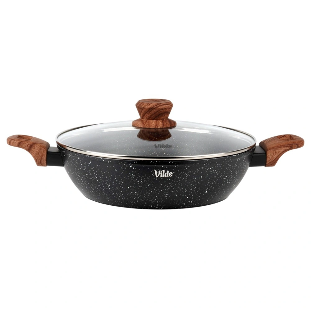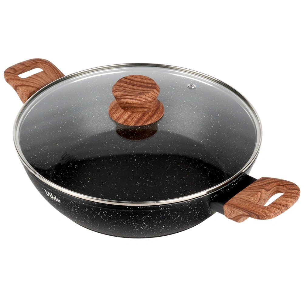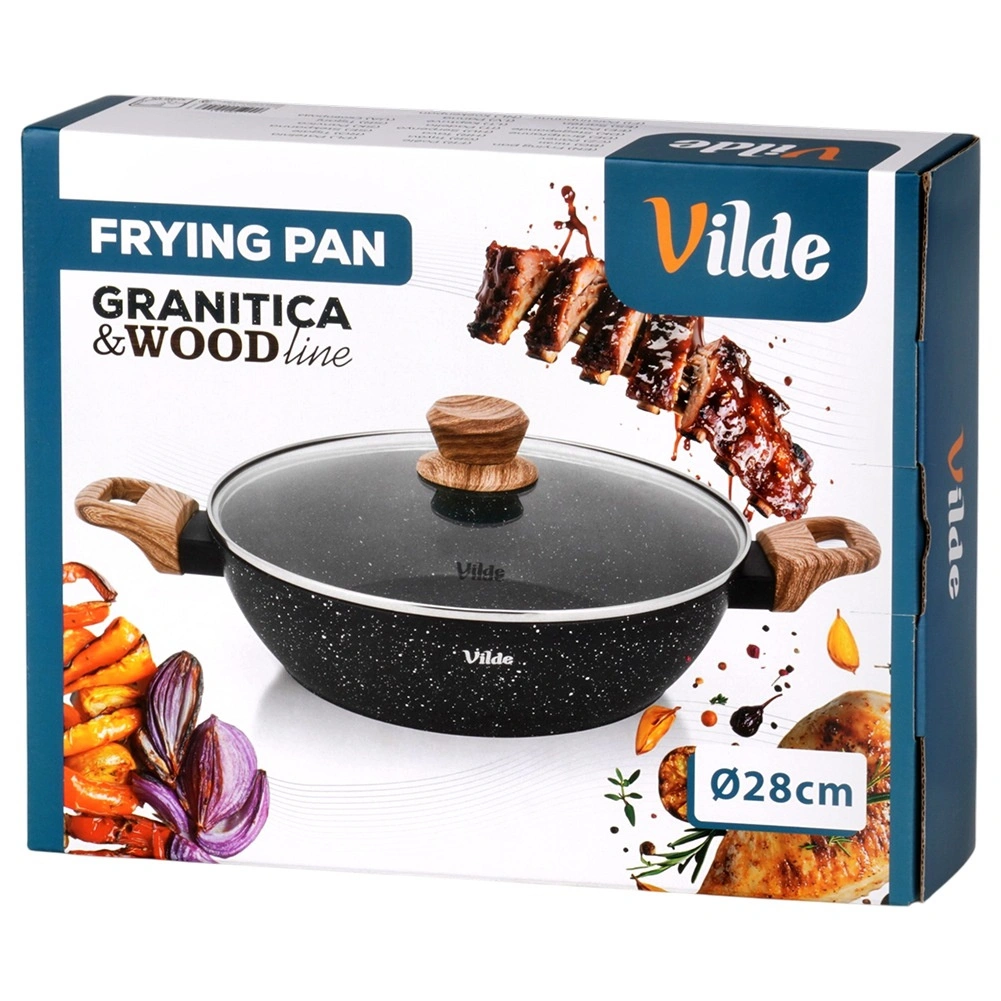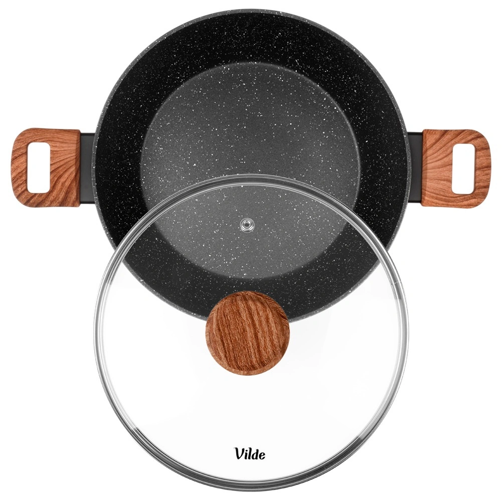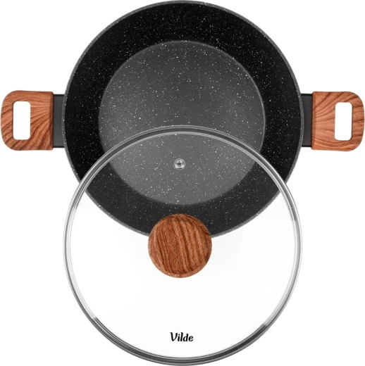 De diepe pan Vilde uit de Granitica Wood-lijn is een veelzijdige hulp bij bakken, stoven en ovengerechten. De duurzame gegoten aluminium body met een antiaanbak granieten laag zorgt voor gelijkmatige warmteverdeling en eenvoudig loslaten van ingrediënten zonder aan te bakken. Het transparante glazen deksel met stoomventiel maakt controle tijdens het koken mogelijk zonder het deksel op te tillen.