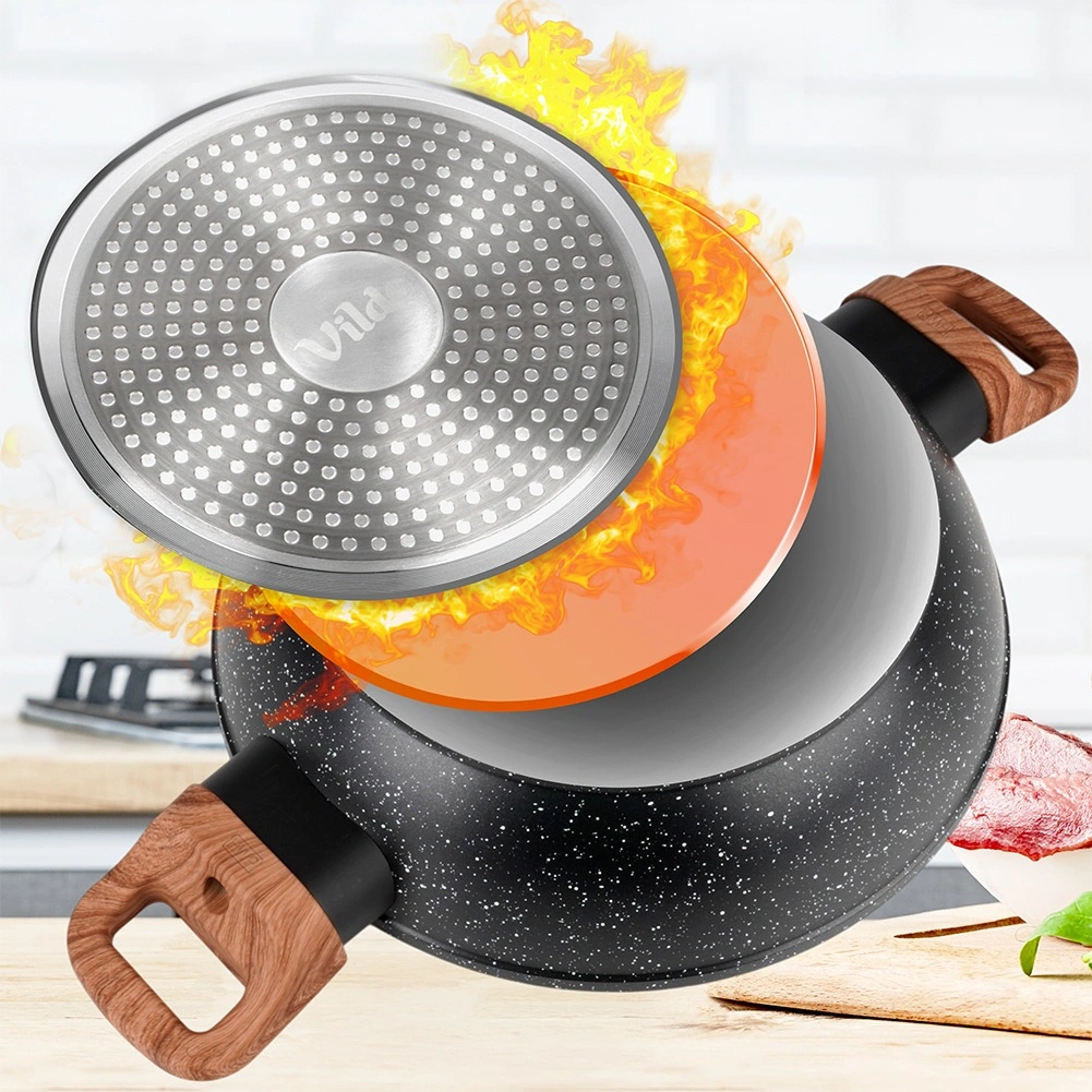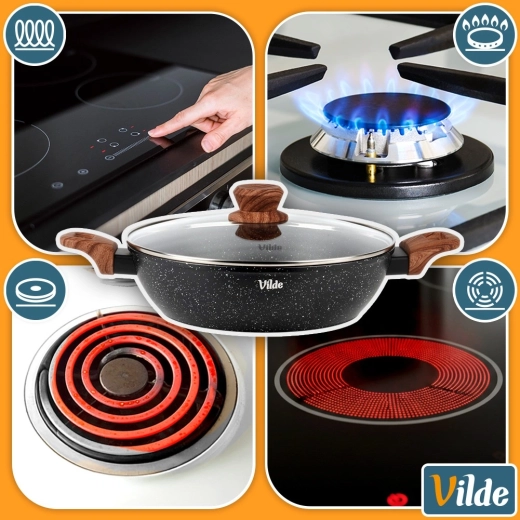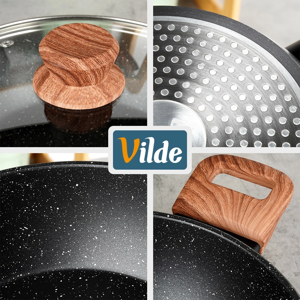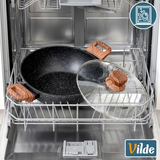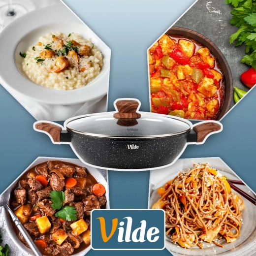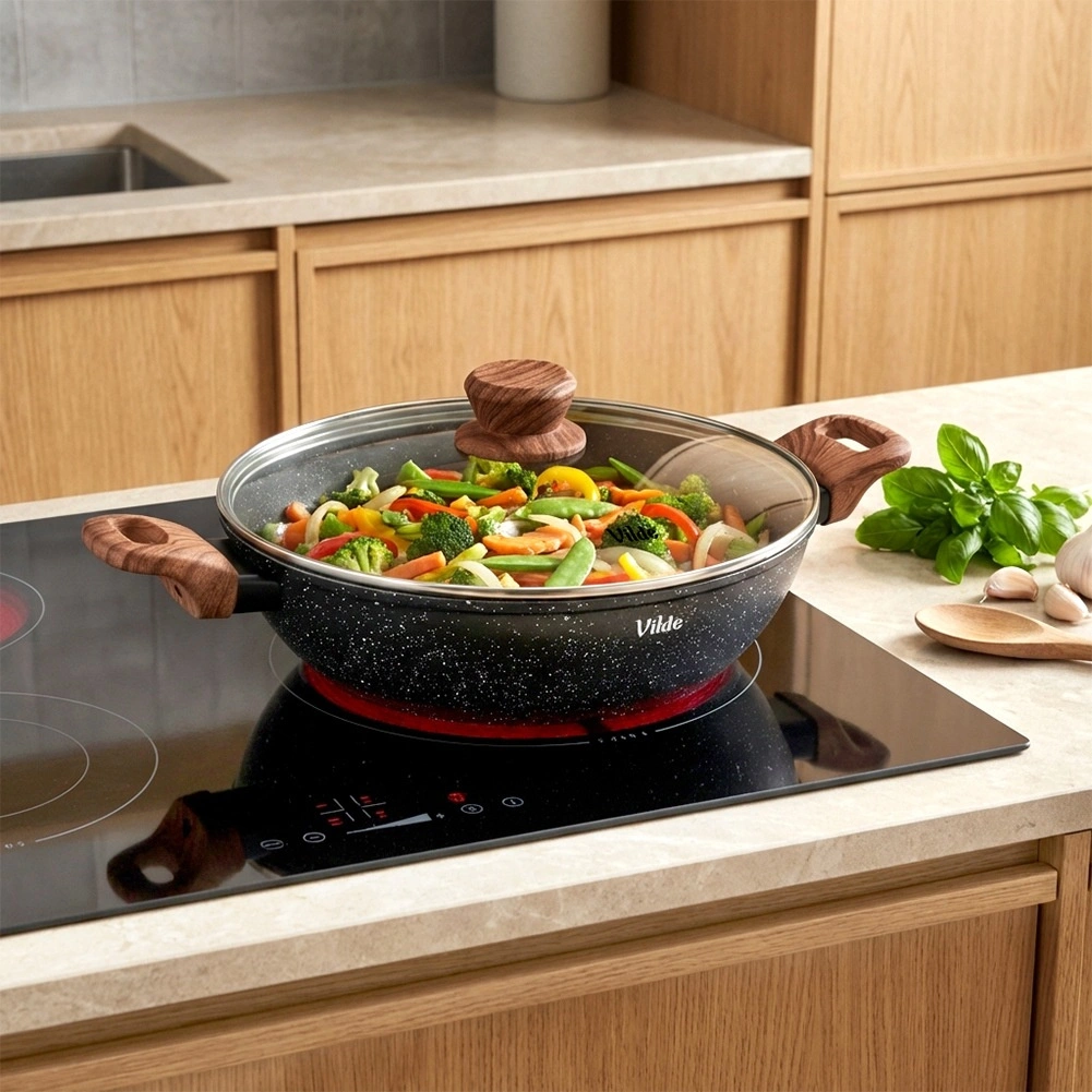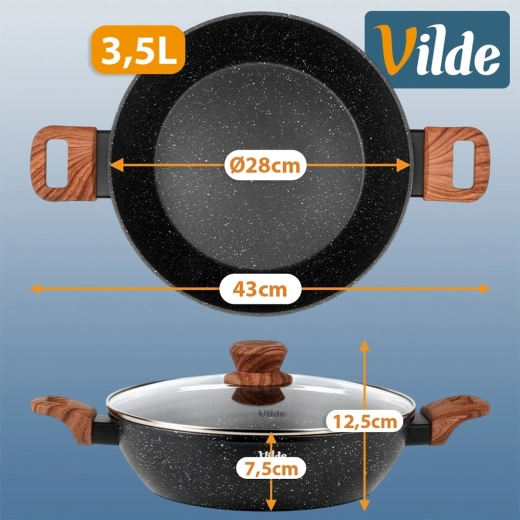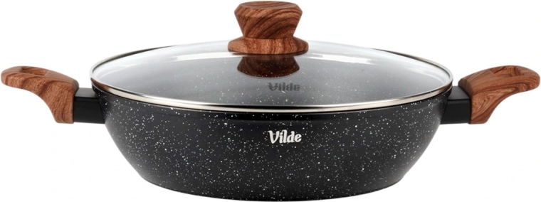 De diepe pan Vilde uit de Granitica Wood-lijn is een veelzijdige hulp bij bakken, stoven en ovengerechten. De duurzame gegoten aluminium body met een antiaanbak granieten laag zorgt voor gelijkmatige warmteverdeling en eenvoudig loslaten van ingrediënten zonder aan te bakken. Het transparante glazen deksel met stoomventiel maakt controle tijdens het koken mogelijk zonder het deksel op te tillen.