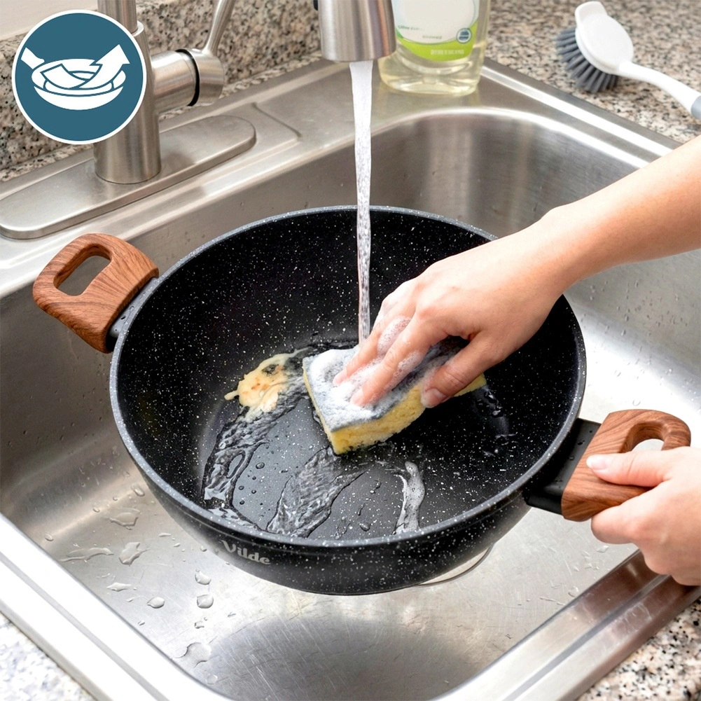 De meerlaagse granieten afwerking minimaliseert de behoefte aan vet, maakt schoonmaken eenvoudiger en voorkomt aanbranden, zelfs bij hogere temperaturen.