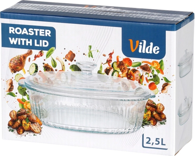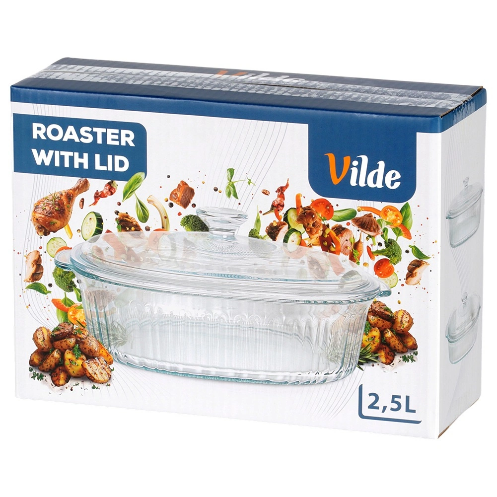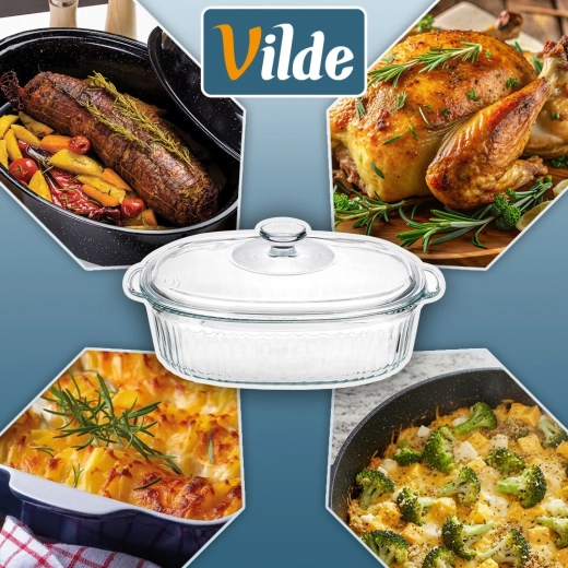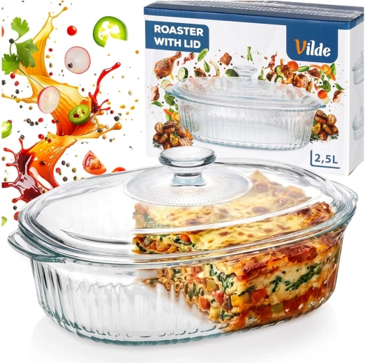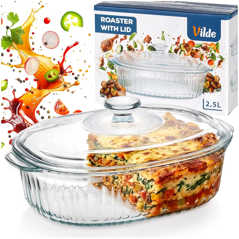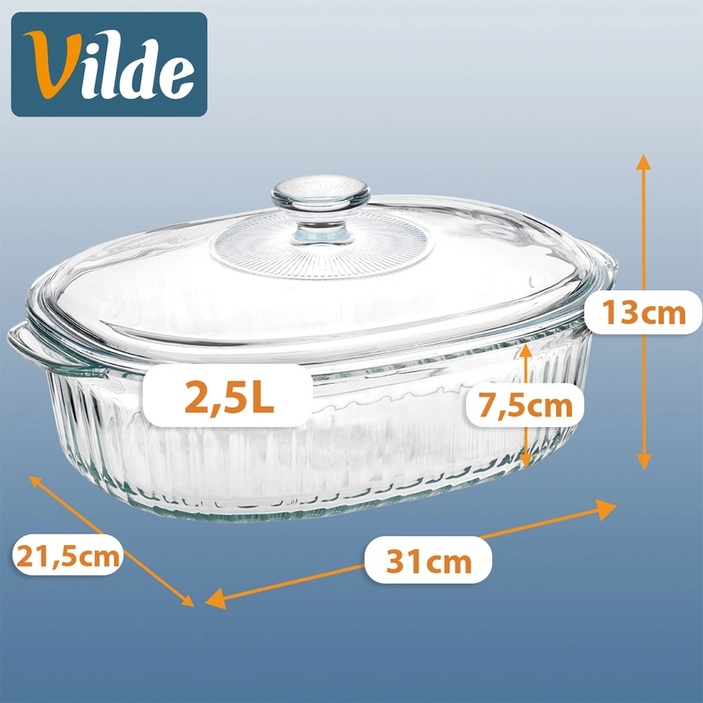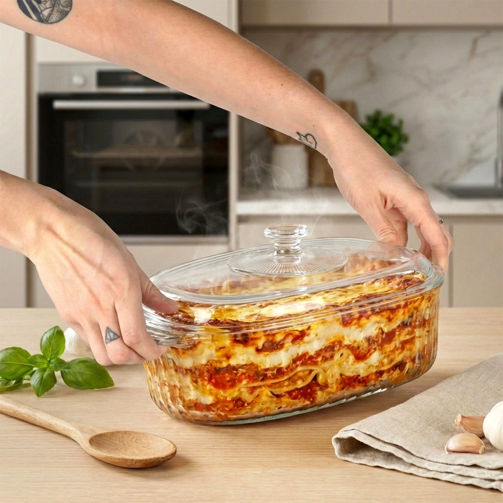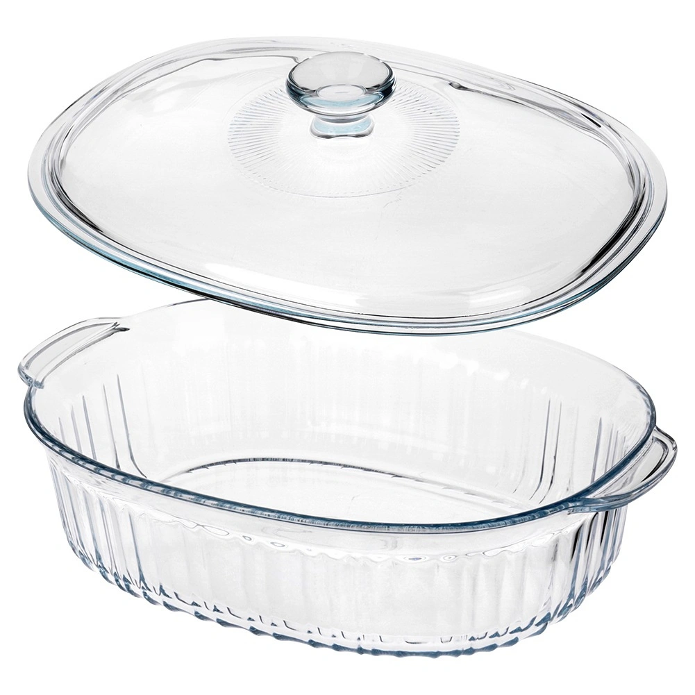 Universeel hittebestendig servies voor dagelijks bakken en serveren. De ovale vorm met decoratieve ribbels staat prachtig op tafel en het transparante glas maakt het eenvoudig om het gaarheidsniveau te volgen. Het deksel helpt vocht en warmte vast te houden, zodat vlees, lasagne of groenten perfect sappig blijven.