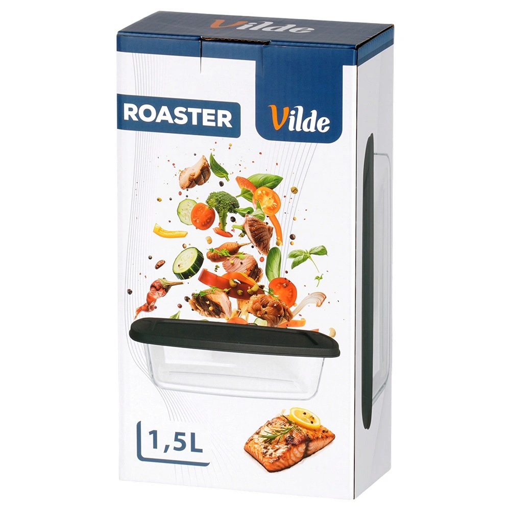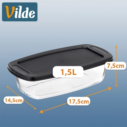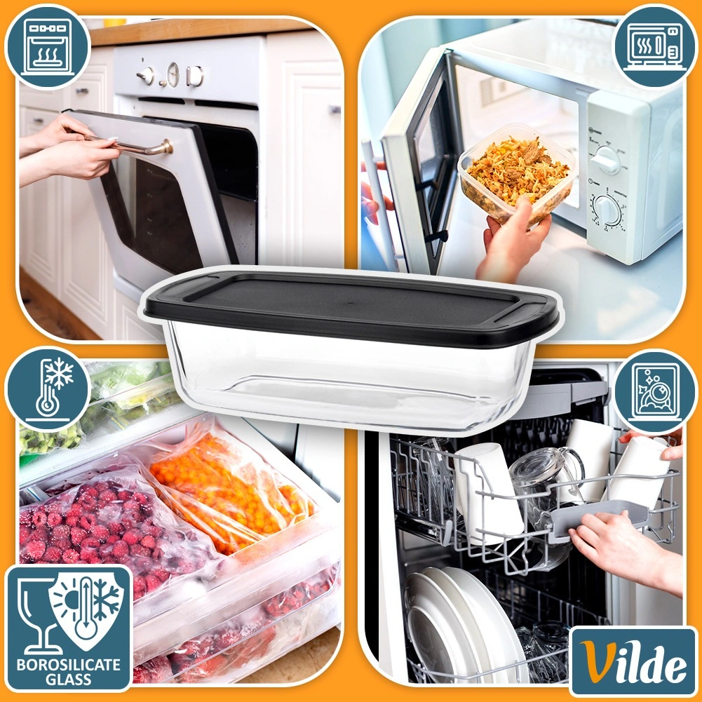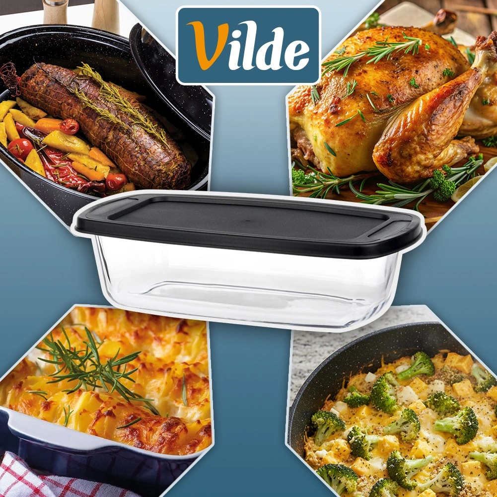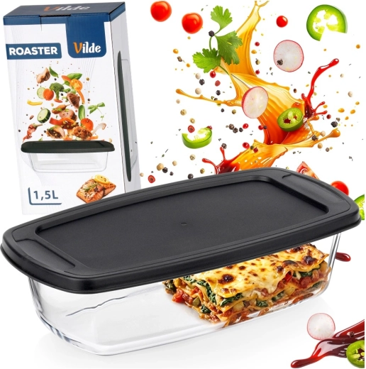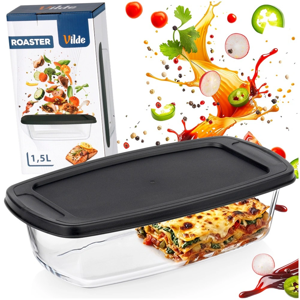 Universele glazen schaal met een inhoud van 1,5 l en een praktisch zwart deksel, ideaal voor bakken, ovengerechten en bewaren van maaltijden. Het duurzame borosilicaatglas weerstaat temperaturen van -30 °C tot +400 °C (deksel van -18 °C tot 120 °C), dus perfect voor oven, magnetron, koelkast en vriezer. Geïntegreerde handgrepen vergemakkelijken het hanteren en het afsluitende deksel helpt het eten langer vers te houden.