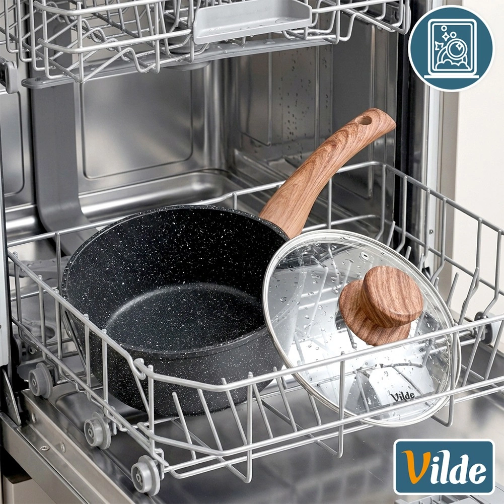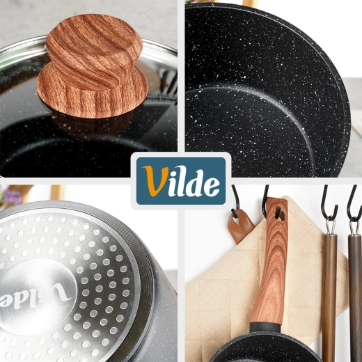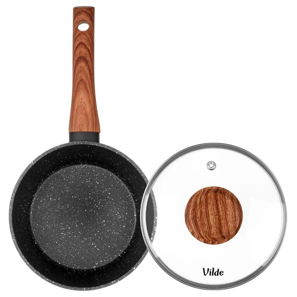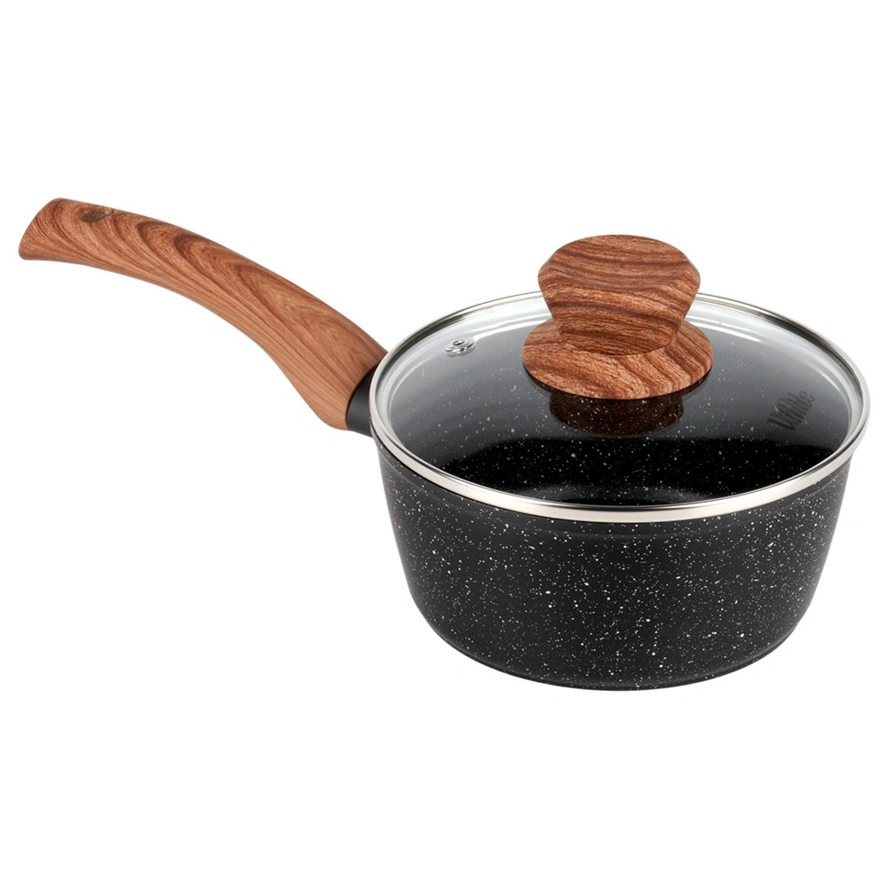 Praktische steelpan met een diameter van 16 cm en een inhoud van 1,2 l van gegoten aluminium met een granieten antiaanbaklaag en een ergonomische soft-touch handgreep in houtdecor. Inclusief een glazen deksel met stoomventiel voor comfortabele kookcontrole. Geschikt voor inductie, gas, elektrisch en keramisch en vaatwasserbestendig.