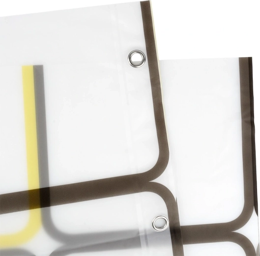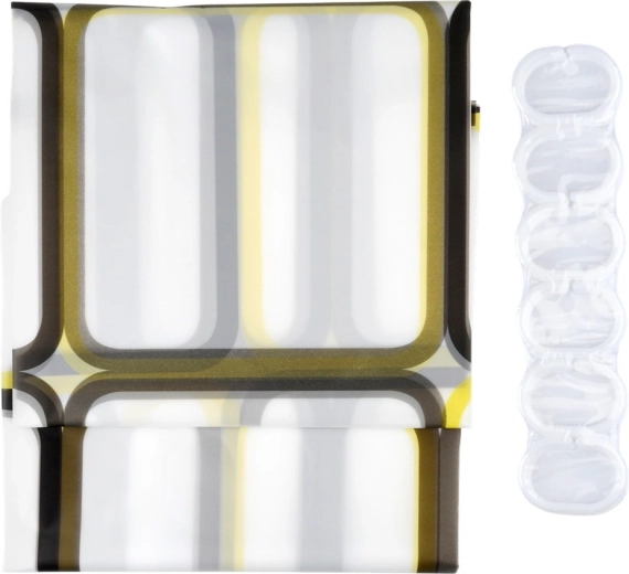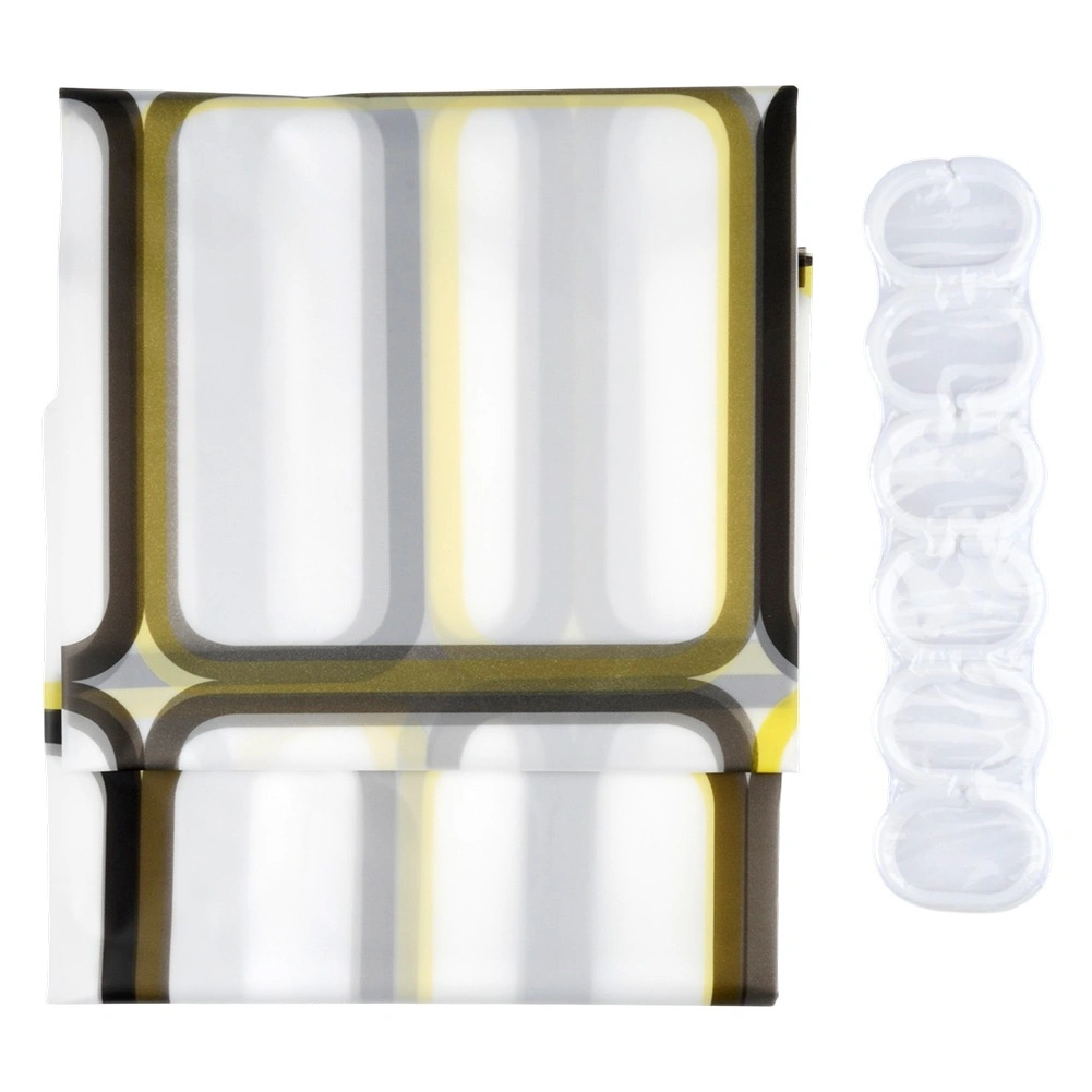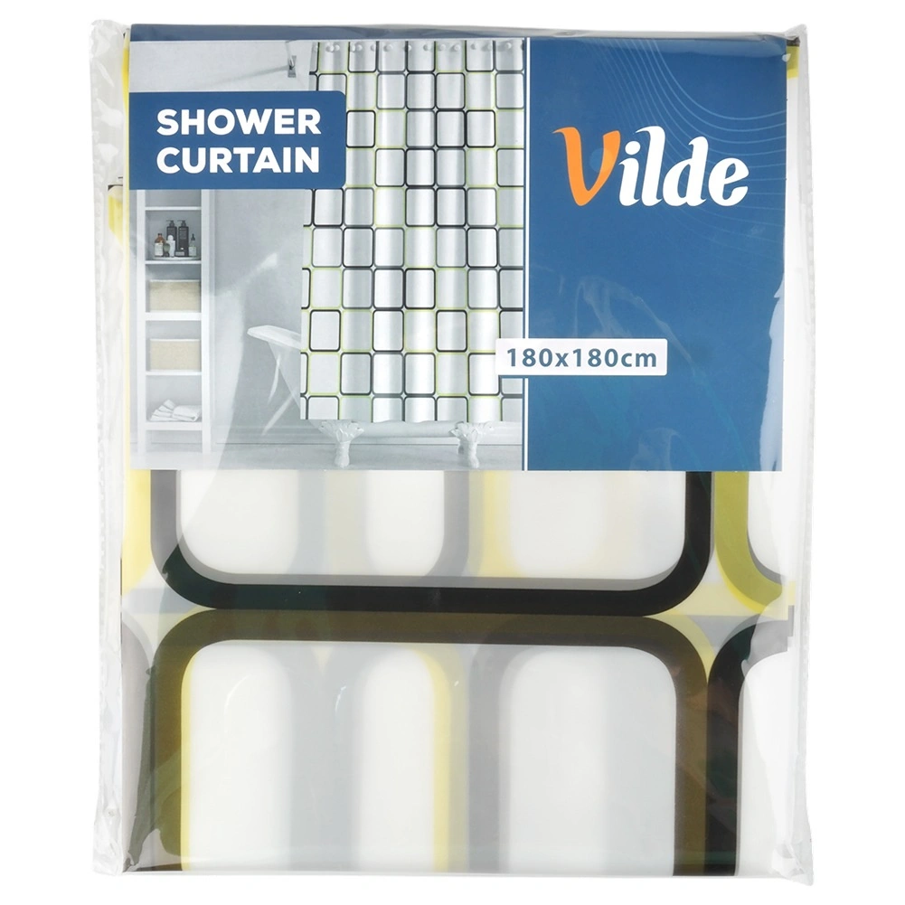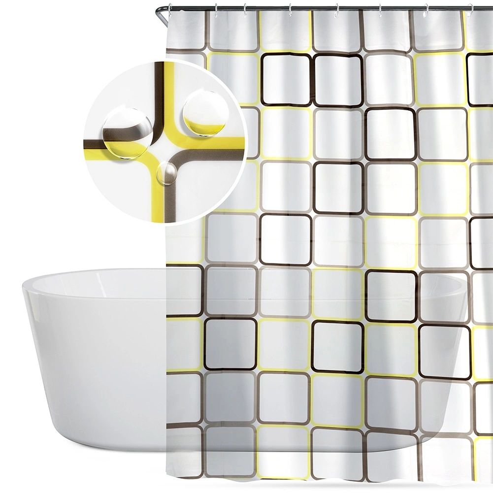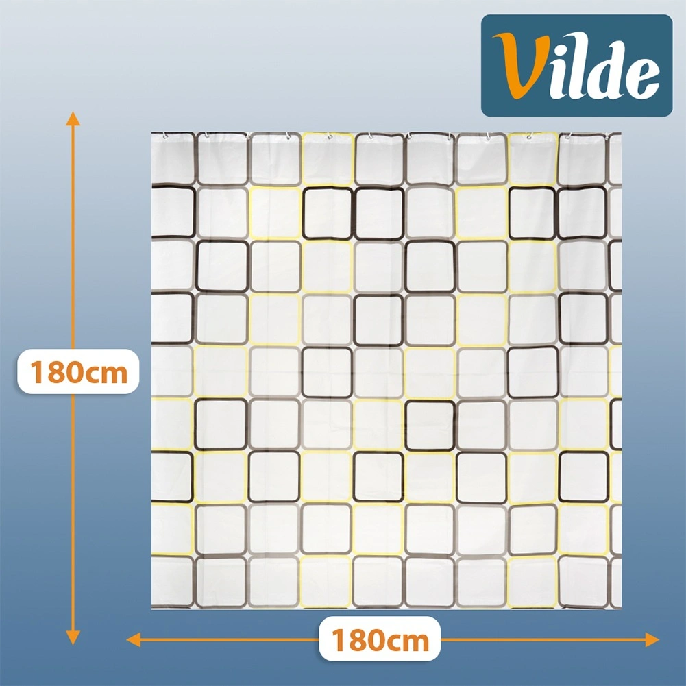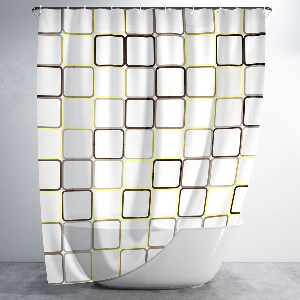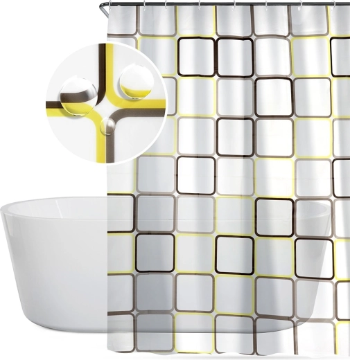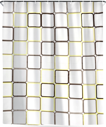 Ontdek een praktische oplossing voor de dagelijkse badkamer: een douchegordijn van PEVA, licht, duurzaam en milieuvriendelijk. De halftransparante witte basis met geometrische vierkanten in gele en bruine tinten geeft je interieur een frisse, moderne look en behoudt tegelijk de nodige privacy.