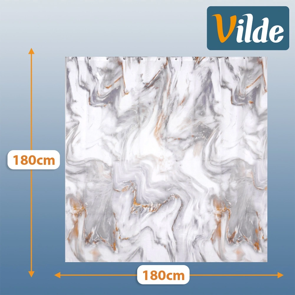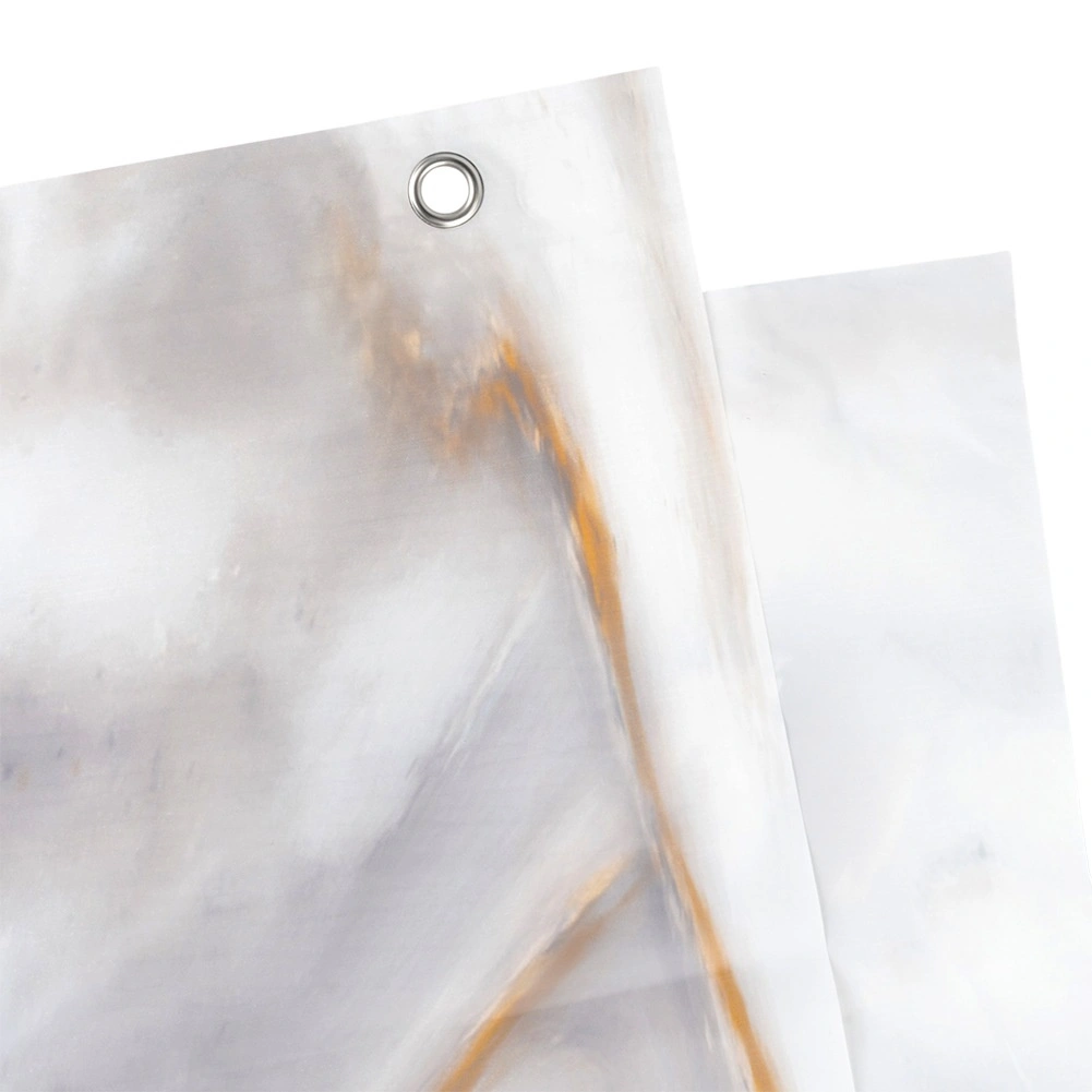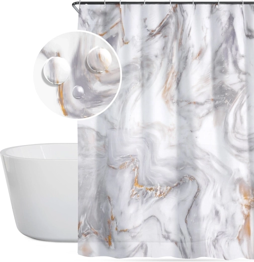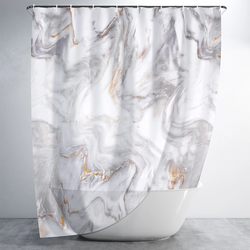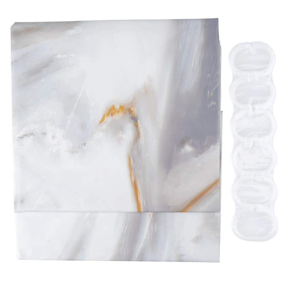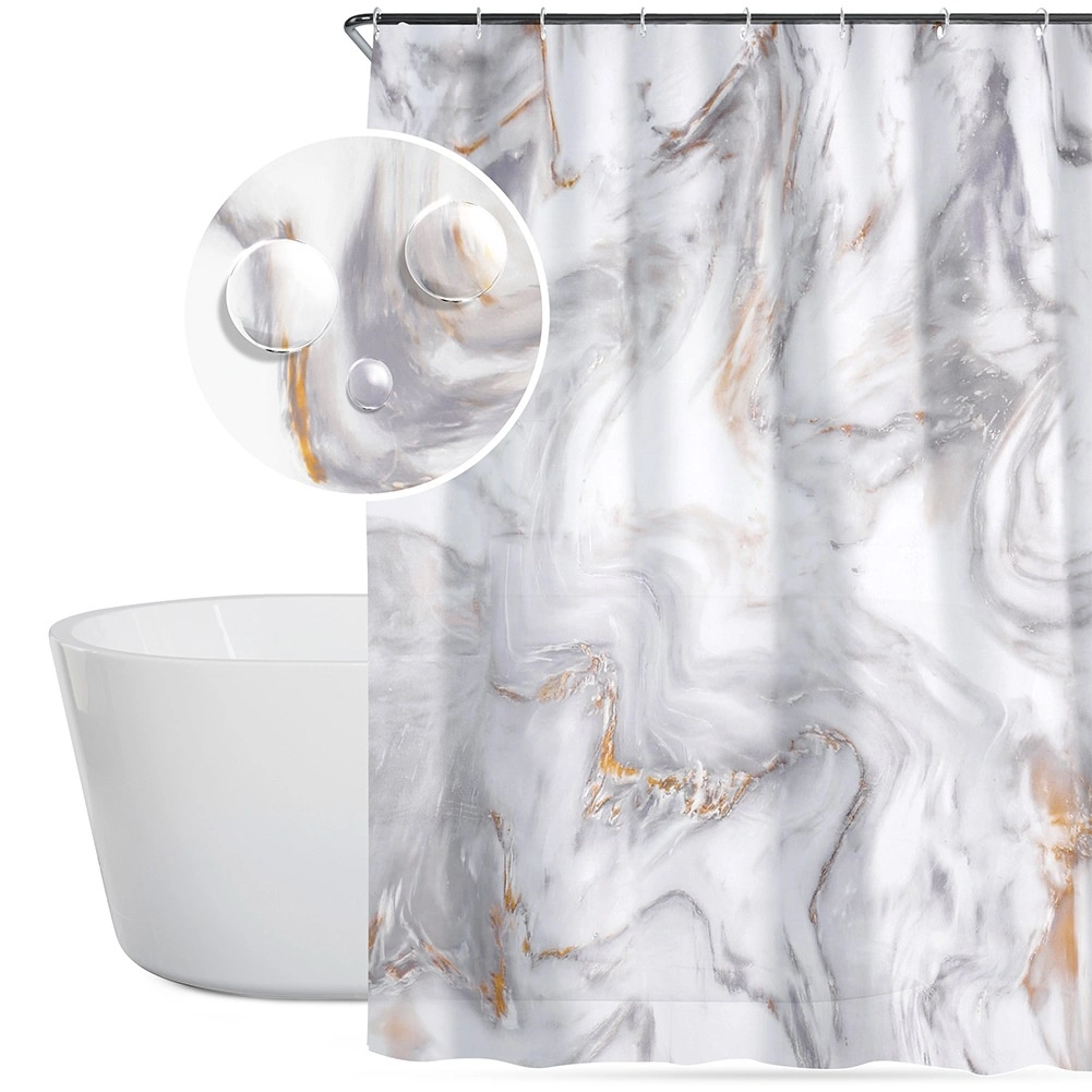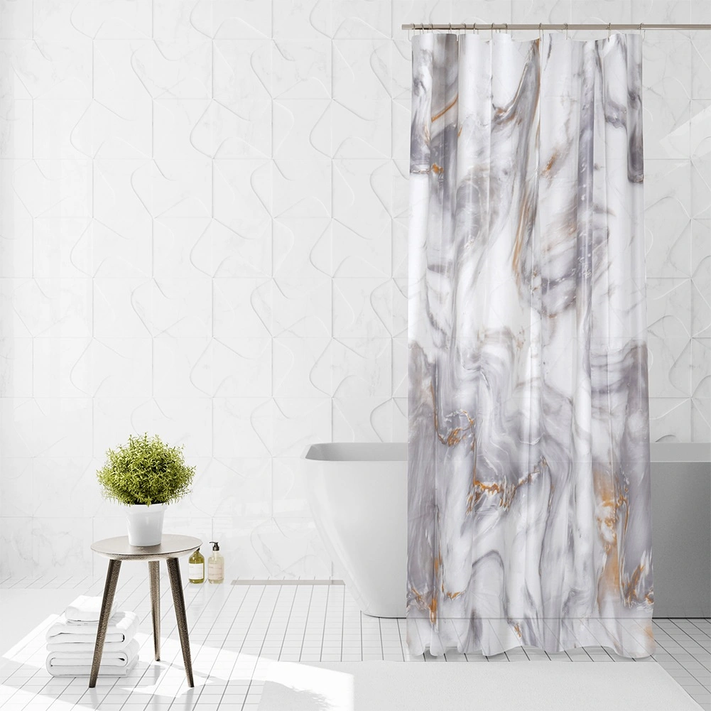 Het elegante marmerdesign transformeert je badkamer in een oogwenk. Het gordijn van het milieuvriendelijke materiaal PEVA is licht, duurzaam en vrij van schadelijke stoffen, dus veilig voor jou en het milieu. Dankzij het waterafstotende oppervlak lopen druppels van de stof af en blijft de ruimte buiten het bad of de douche droog.