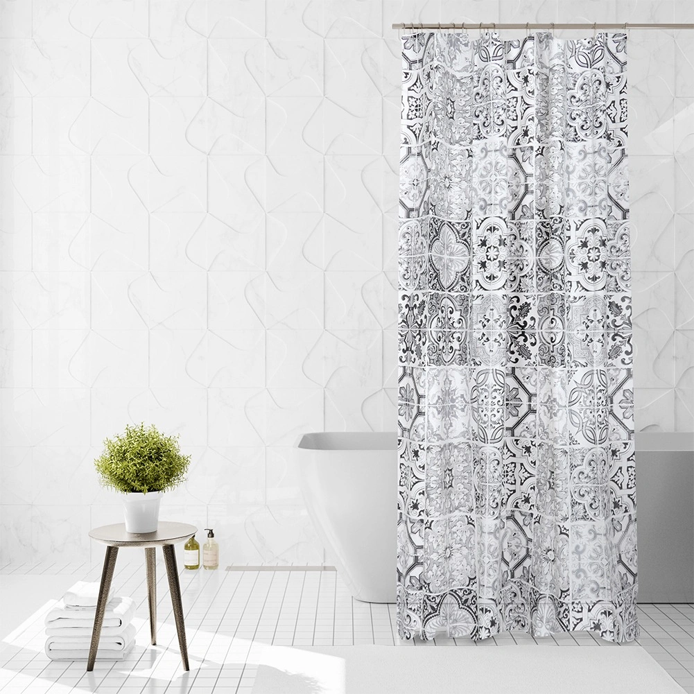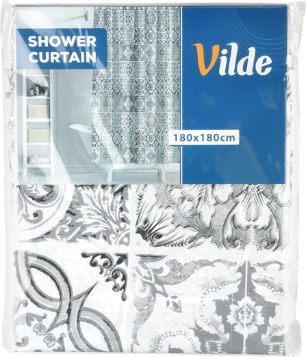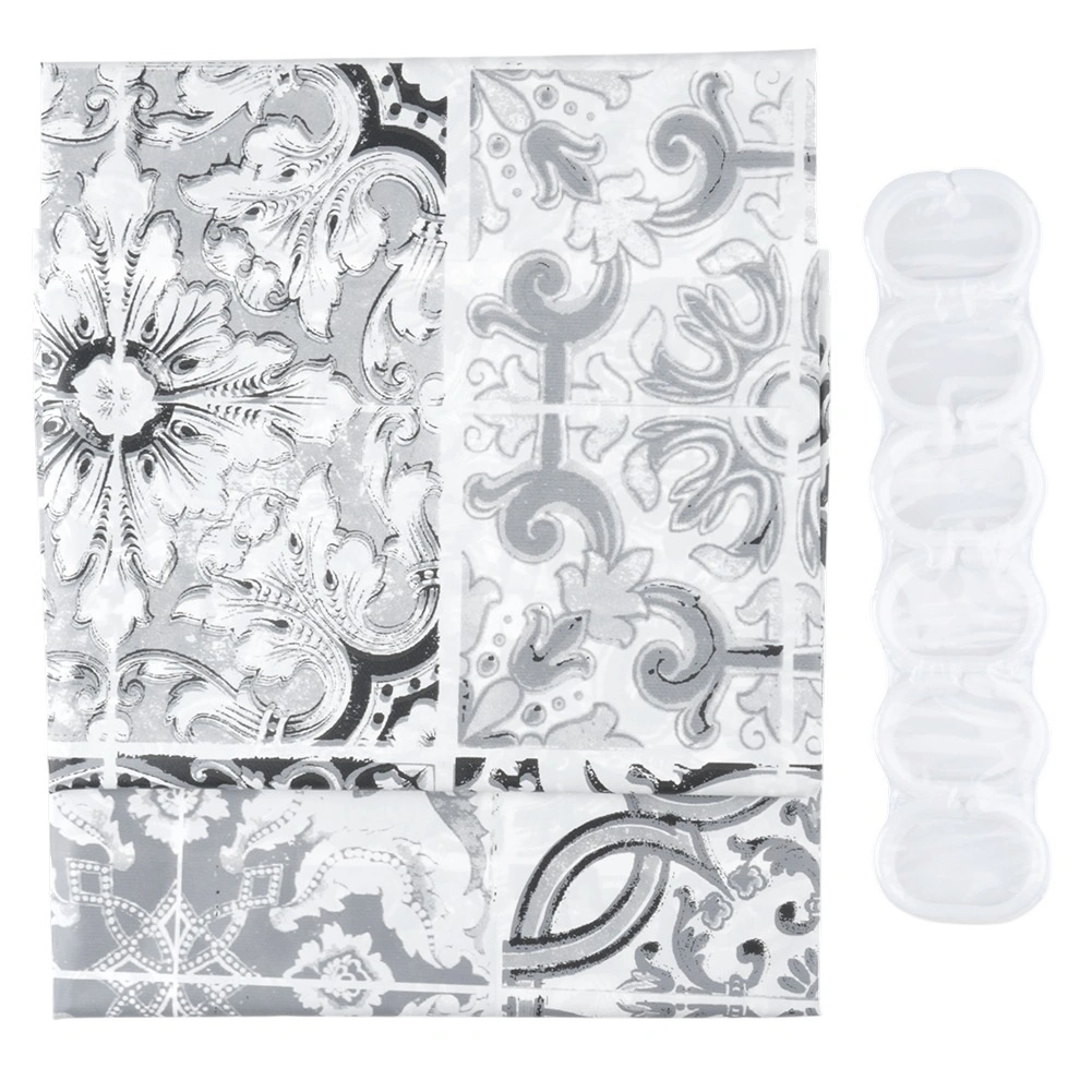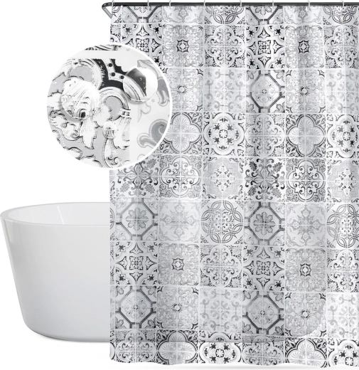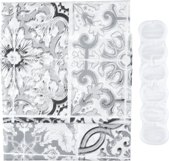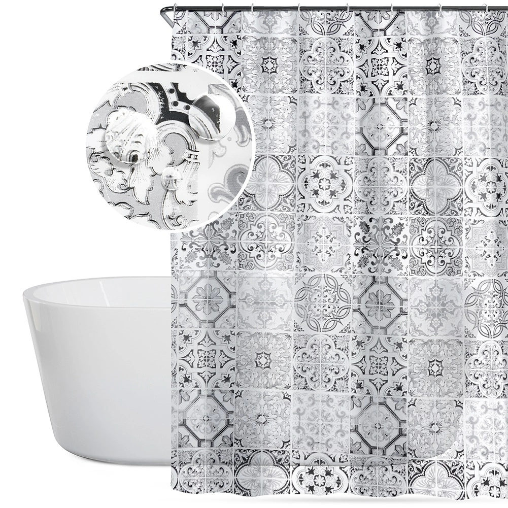 Stijlvol douchegordijn van milieuvriendelijk PEVA-materiaal met afmetingen 180 × 180 cm en 12 haken in de verpakking. Biedt privacy, voorkomt effectief waterspatten en is dankzij het waterafstotende oppervlak gemakkelijk schoon te maken. Het moderne grijs-witte, door tegels geïnspireerde patroon geeft je badkamer een elegante uitstraling.