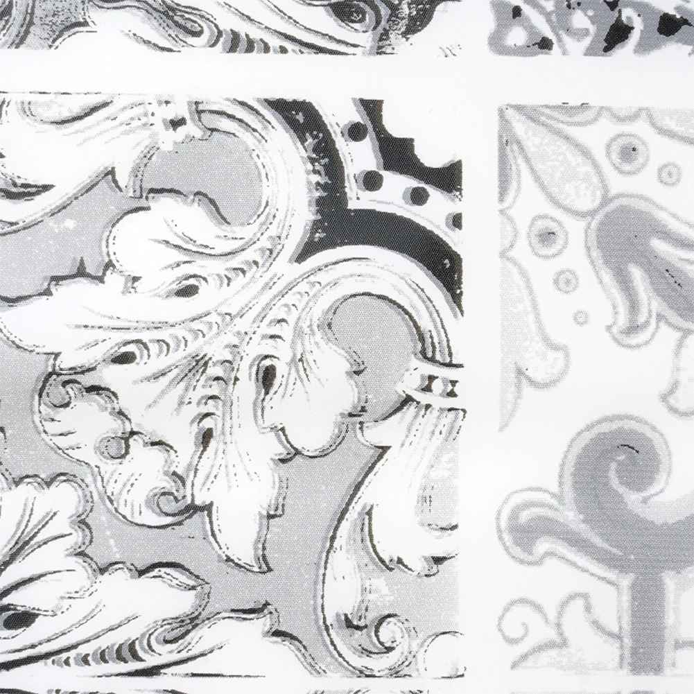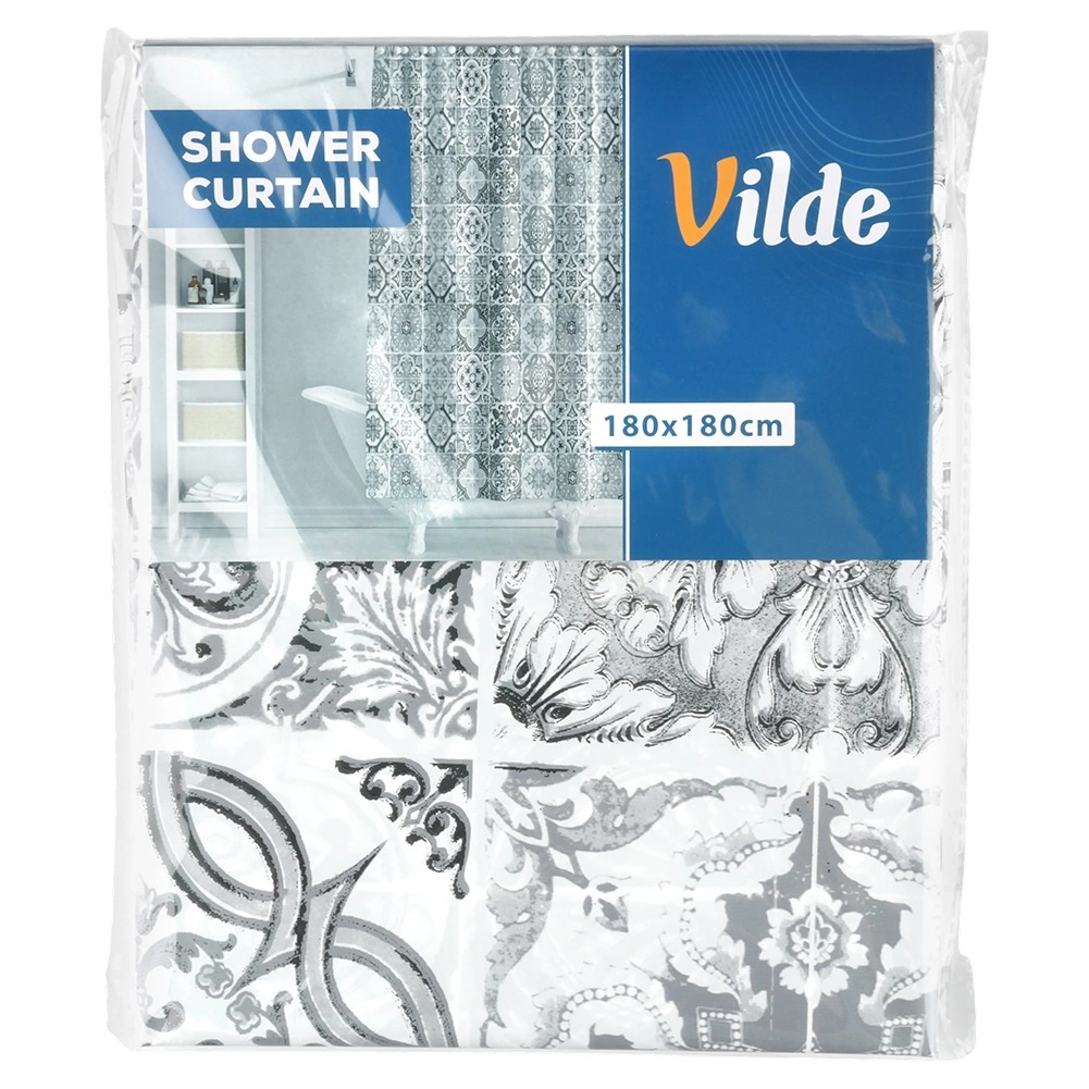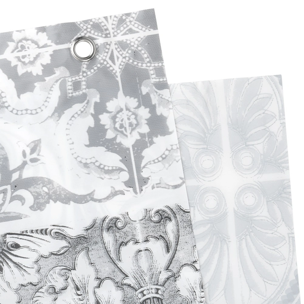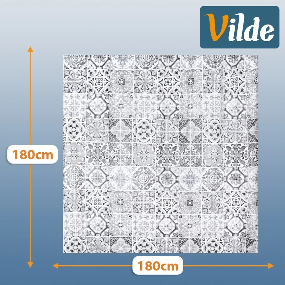 Stijlvol douchegordijn van milieuvriendelijk PEVA-materiaal met afmetingen 180 × 180 cm en 12 haken in de verpakking. Biedt privacy, voorkomt effectief waterspatten en is dankzij het waterafstotende oppervlak gemakkelijk schoon te maken. Het moderne grijs-witte, door tegels geïnspireerde patroon geeft je badkamer een elegante uitstraling.