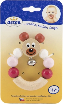 Een schattige houten rammelaar met een beertje in roze zal elke baby blij maken. Het geïntegreerde belletje rinkelt zacht, de rammelaar is zeer licht en dankzij de compacte afmetingen van 7 × 9 cm ligt hij perfect in kleine handjes. Het product voldoet aan de strenge EU-veiligheidseisen voor speelgoed en is voorzien van het certificaat Veilig speelgoed.