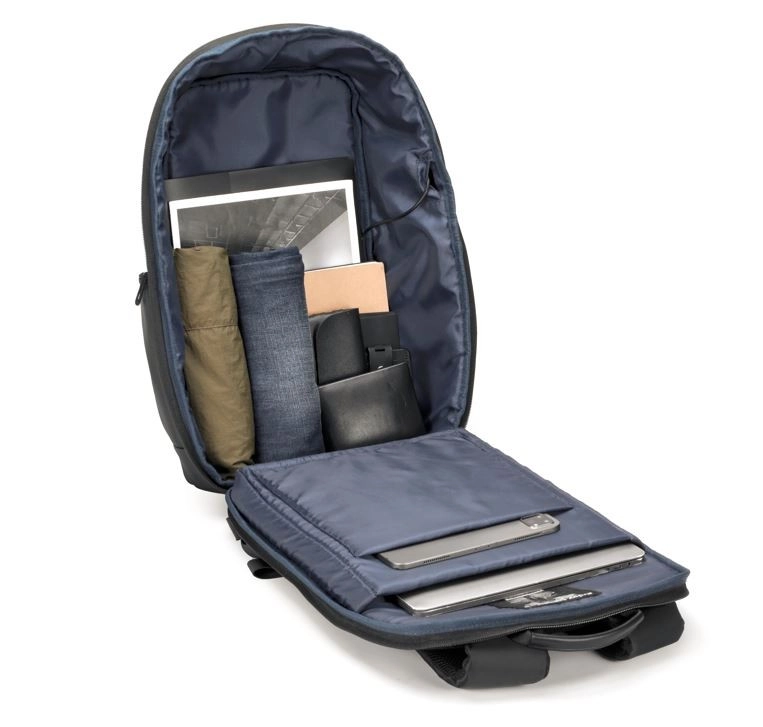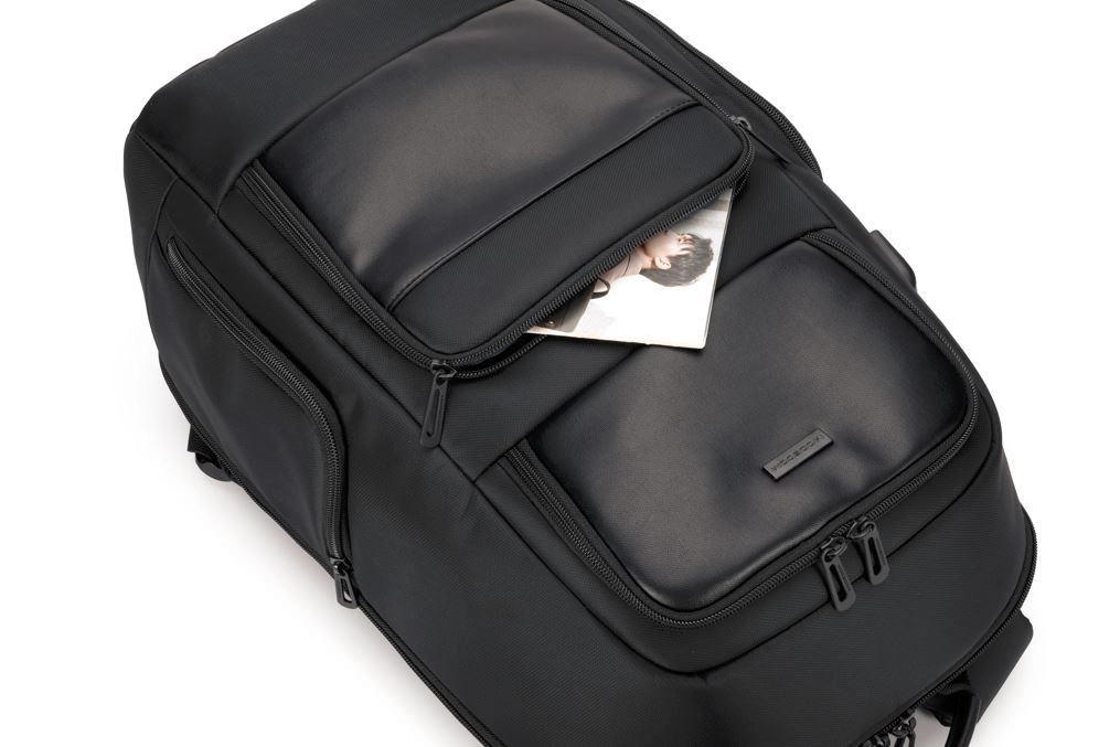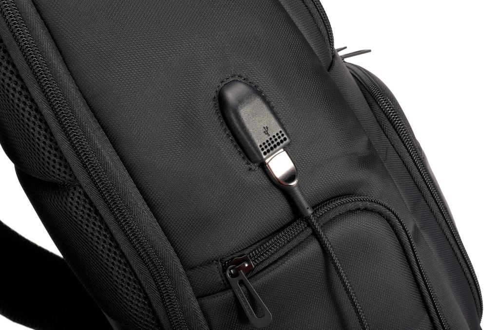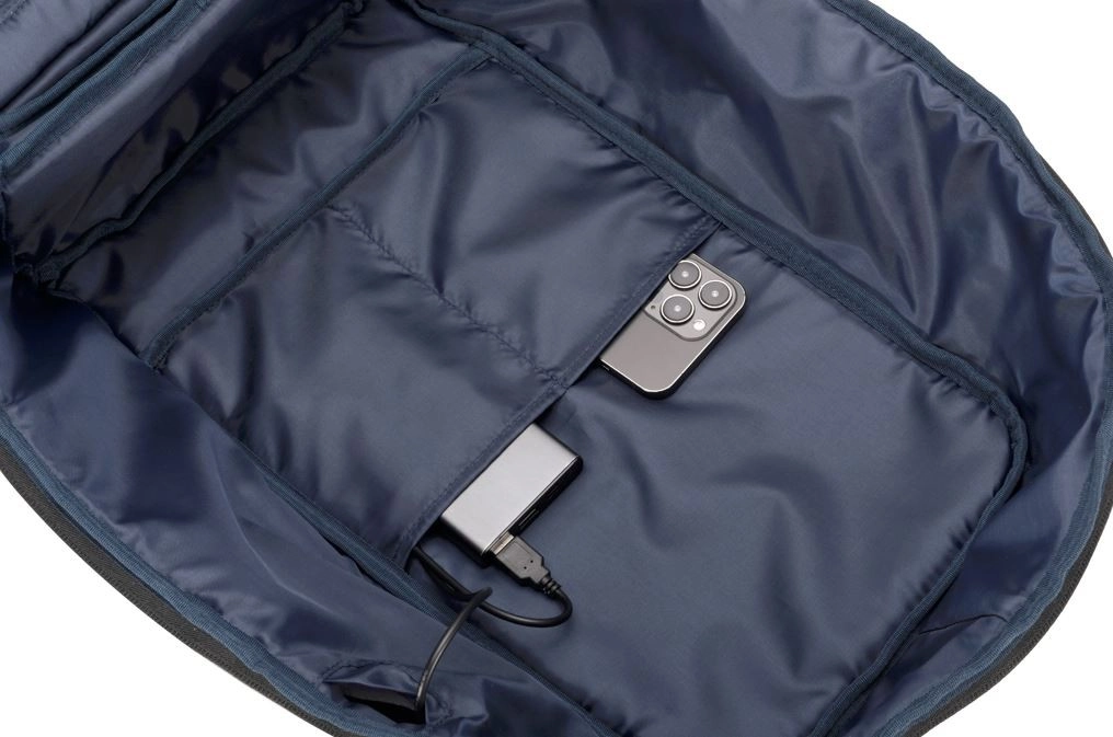 Sluit een powerbank binnenin de rugzak aan en laad je telefoon gemakkelijk op via de externe USB‑uitgang – ideaal voor dagelijks woon‑werkverkeer en reizen.