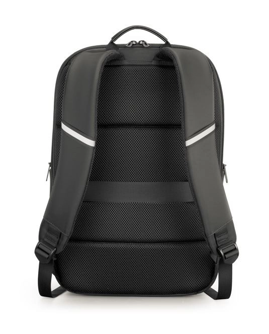 Ademend rugpand, verstelbare schouderbanden met reflecterende elementen en een band voor bevestiging op een koffer zorgen voor comfort en zichtbaarheid bij elke stap.