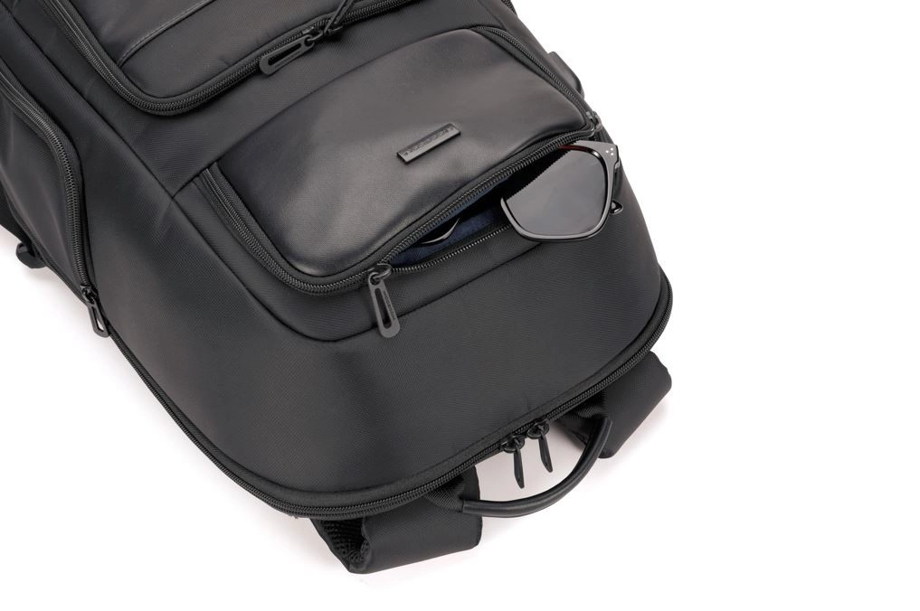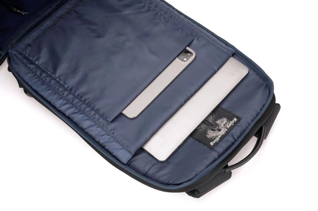 De buitenkant beschikt over vier ritsvakken, inclusief zijvakken voor een fles of paraplu en voorvakken voor snelle toegang tot kleine items. Het ademende, gewatteerde rugpand en de verstelbare schouderbanden met reflecterende elementen vergroten het comfort en de veiligheid in het donker. Een praktische band voor bevestiging aan het handvat van een koffer maakt reizen nog aangenamer.