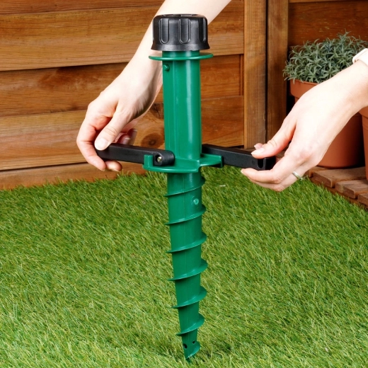 De spiraalschroef draait diep de grond in en houdt de parasol stevig op zijn plaats, zelfs bij windvlagen.