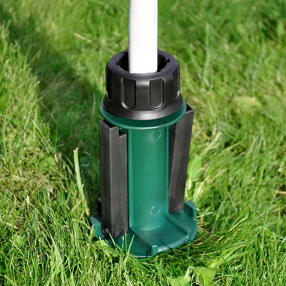 De bovenste aandraaiklem past zich aan de gangbare stokdiameters van parasols aan (ca. 2,2–3,3 cm) en houdt ze stevig op hun plek. Zijwaarts uitklapbare handgrepen zorgen voor hefboomwerking voor eenvoudig indraaien en verwijderen. Ideale keuze voor tuin, strand, vakantiehuis en kamperen – zonder zware betonnen voeten.