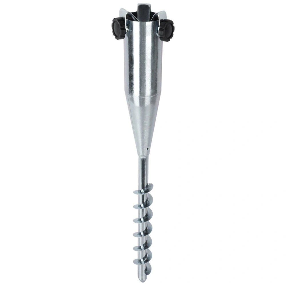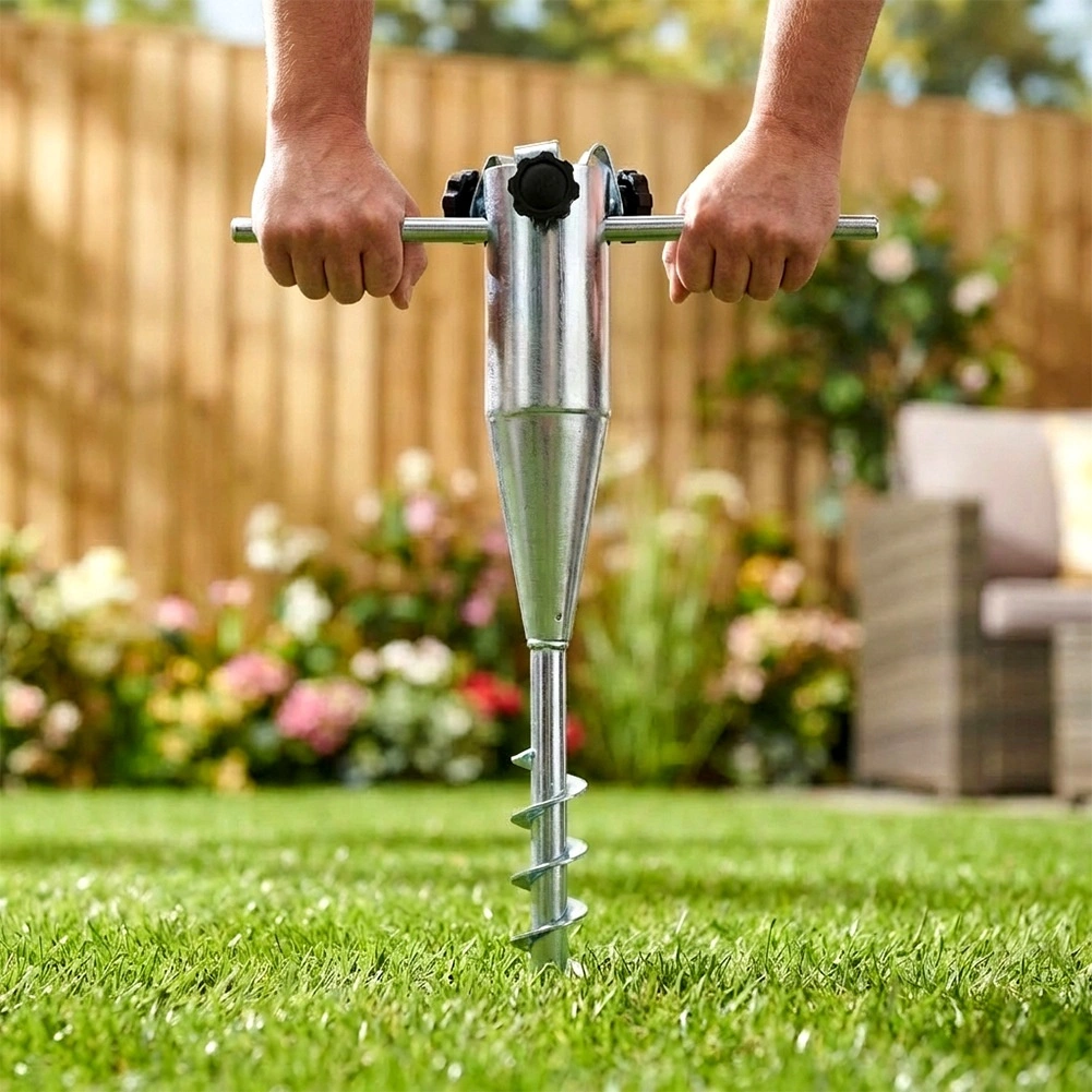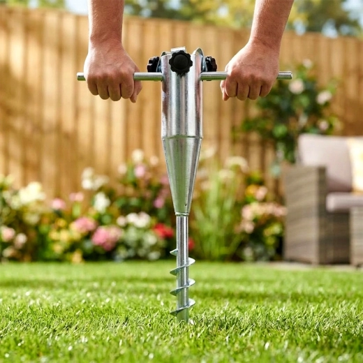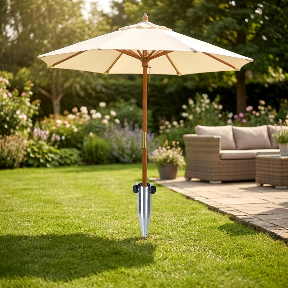De spiraalvormige schroefdraad boort zich stevig in aarde, zand of gazon en houdt de parasol stabiel, ook bij wind.