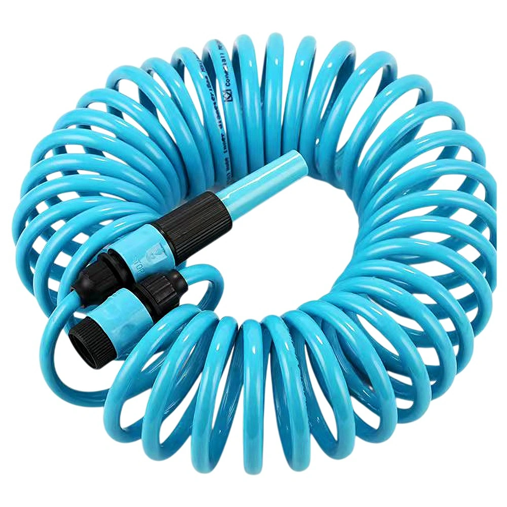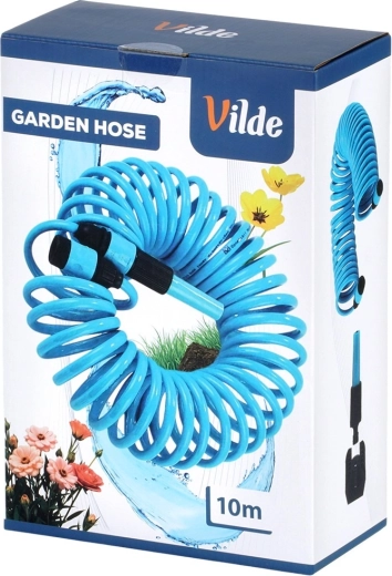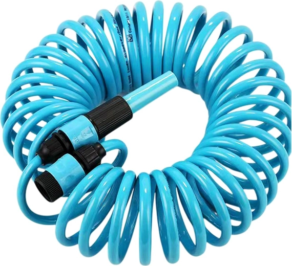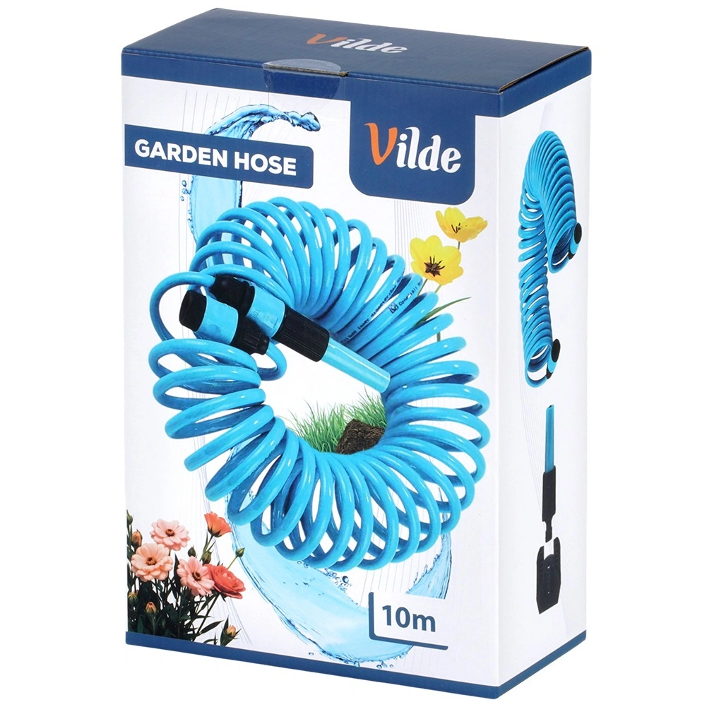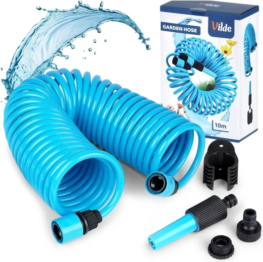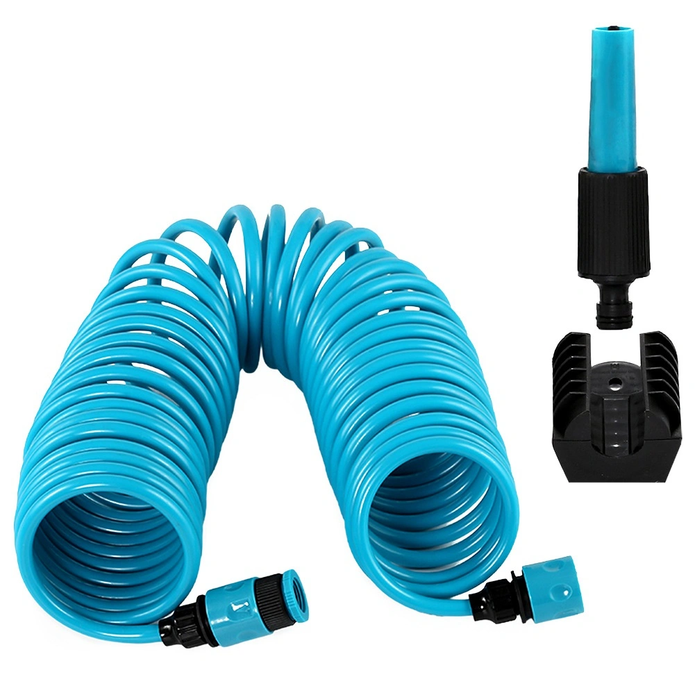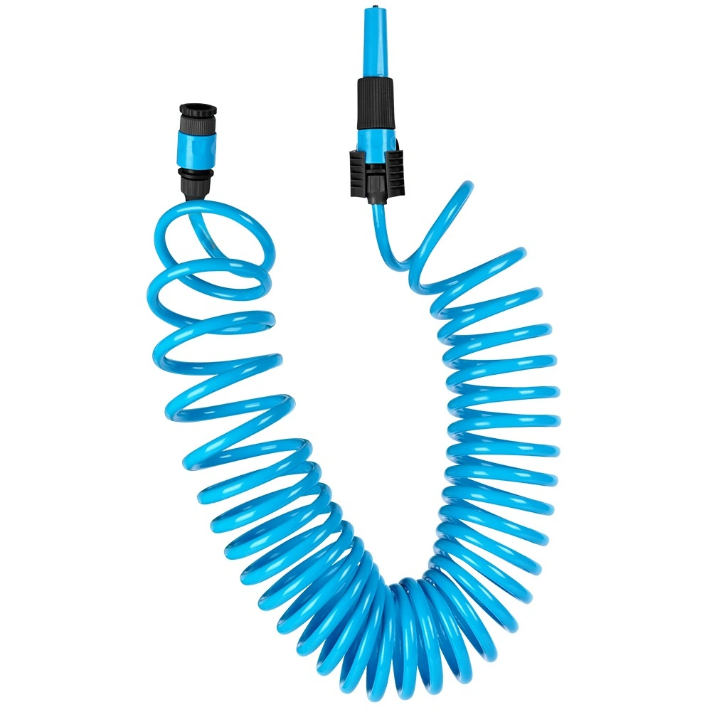 Praktische spiraalvormige tuinslang van 10 m met zelfterugtrekkend ontwerp bespaart ruimte en vereenvoudigt het werk. Inclusief spuitpistool, snelkoppelingen en wandhouder. De slang is licht buigzaam, duurzaam en rolt automatisch op na gebruik, zodat hij niet in de knoop raakt en geen handmatig oprollen vereist.