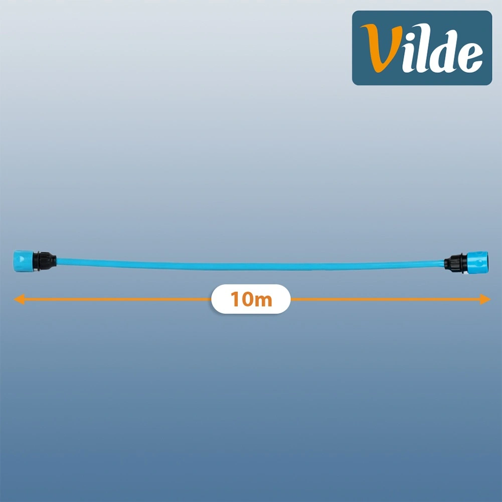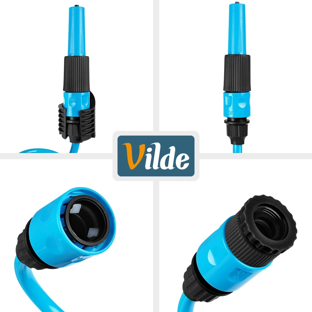 De complete set bevat alles wat je nodig hebt: twee snelkoppelingen voor snelle aansluiting op de kraan en accessoires, een spuitpistool voor comfortabele regeling van de waterstraal en een wandhouder voor overzichtelijke opslag. De duurzame kunststof uitvoering in blauw zorgt voor flexibiliteit en een lange levensduur.