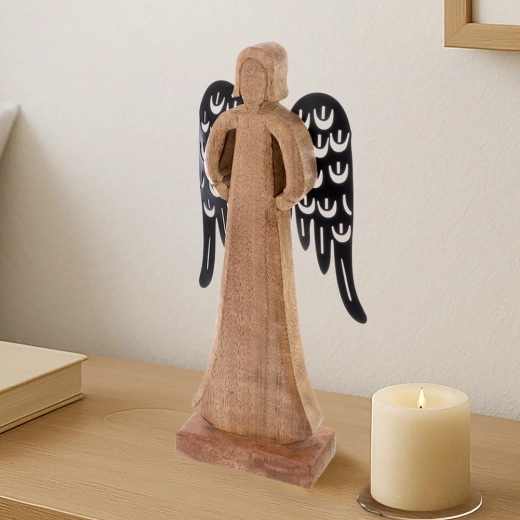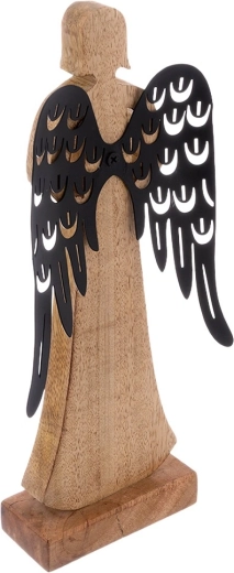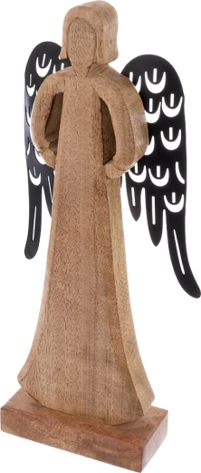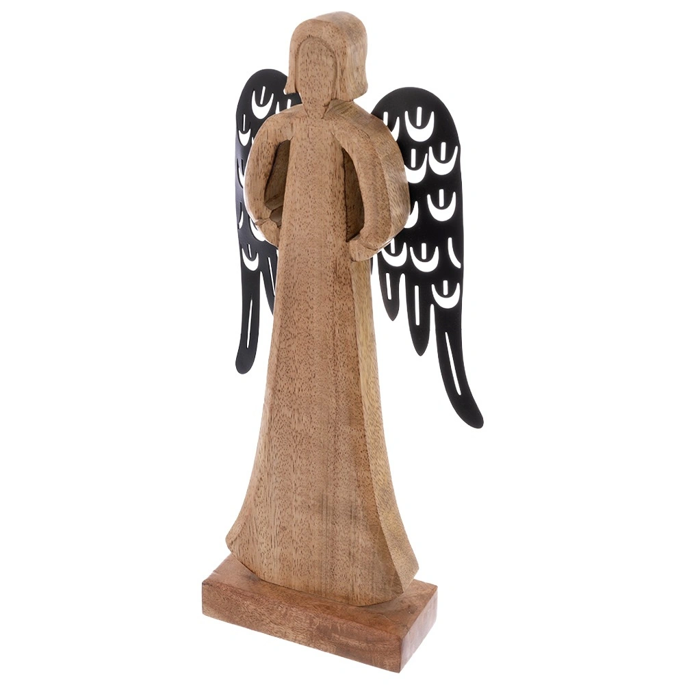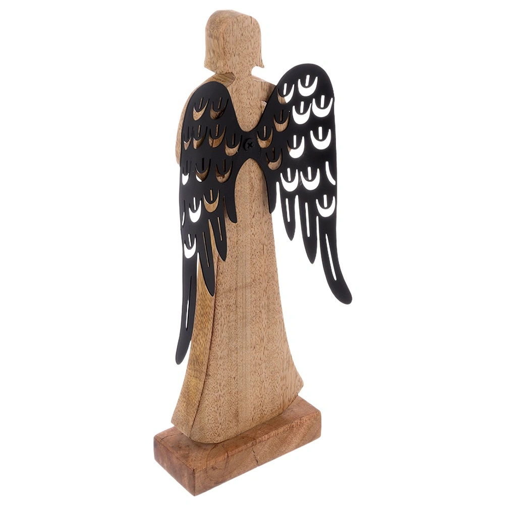 Dit indrukwekkende engelenbeeld is handgemaakt van natuurlijk mangohout en aangevuld met contrasterende zwarte metalen vleugels met een decoratieve uitsnede. De tijdloze uitvoering komt prachtig tot zijn recht op een plank, dressoir of salontafel en past moeiteloos in een Scandinavische, boho- of moderne stijl.