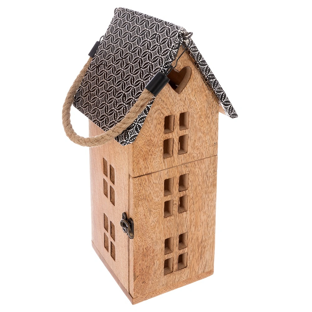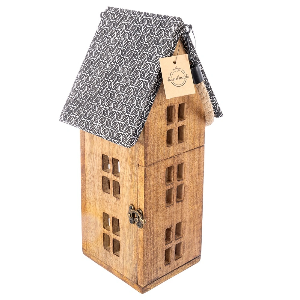 Ontdek deze unieke lantaarn in de vorm van een huisje die een warm sfeerlicht creëert in de woonkamer, slaapkamer en op de overdekte patio. Handgemaakt van mangohout met een natuurlijke nerf en kleurschakeringen die perfect passen bij zowel moderne als landelijke interieurs. Het metalen dak en het kwaliteitsbeslag zorgen voor een lange levensduur, terwijl de LED-kaars veilig is zonder rook en roet.
