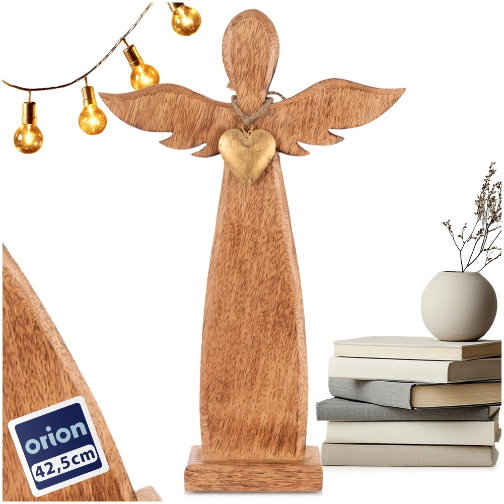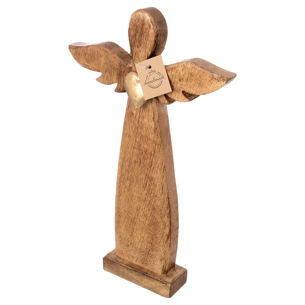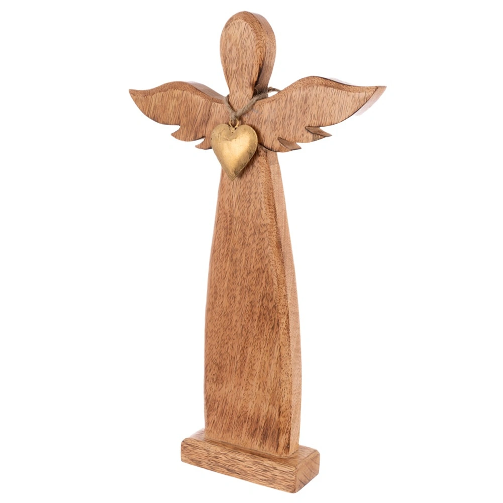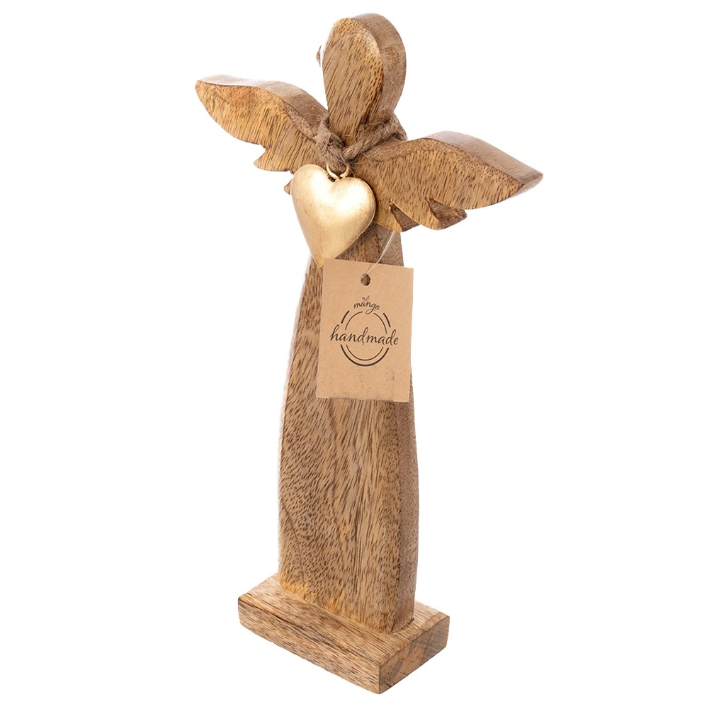 Elegant houten engelenbeeld van mangohout met een decoratief hart in goudkleur dat ieder interieur verfraait. Dankzij de natuurlijke afwerking past het in zowel moderne als rustieke ruimtes en is het perfect als stijlvolle decoratie voor het hele jaar en als origineel cadeau. Afmetingen ca. 25,5 × 5 × 42 cm.