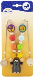 Het gordijn voor kinderwagen met Molletje is een ideale hulp voor ouders die hun kinderen willen vermaken tijdens wandelingen en tegelijkertijd willen introduceren in de wereld van stripheld Molletje. Houten delen en textiele elementen bieden stimulatie voor zowel zicht als tastzin van uw kind.