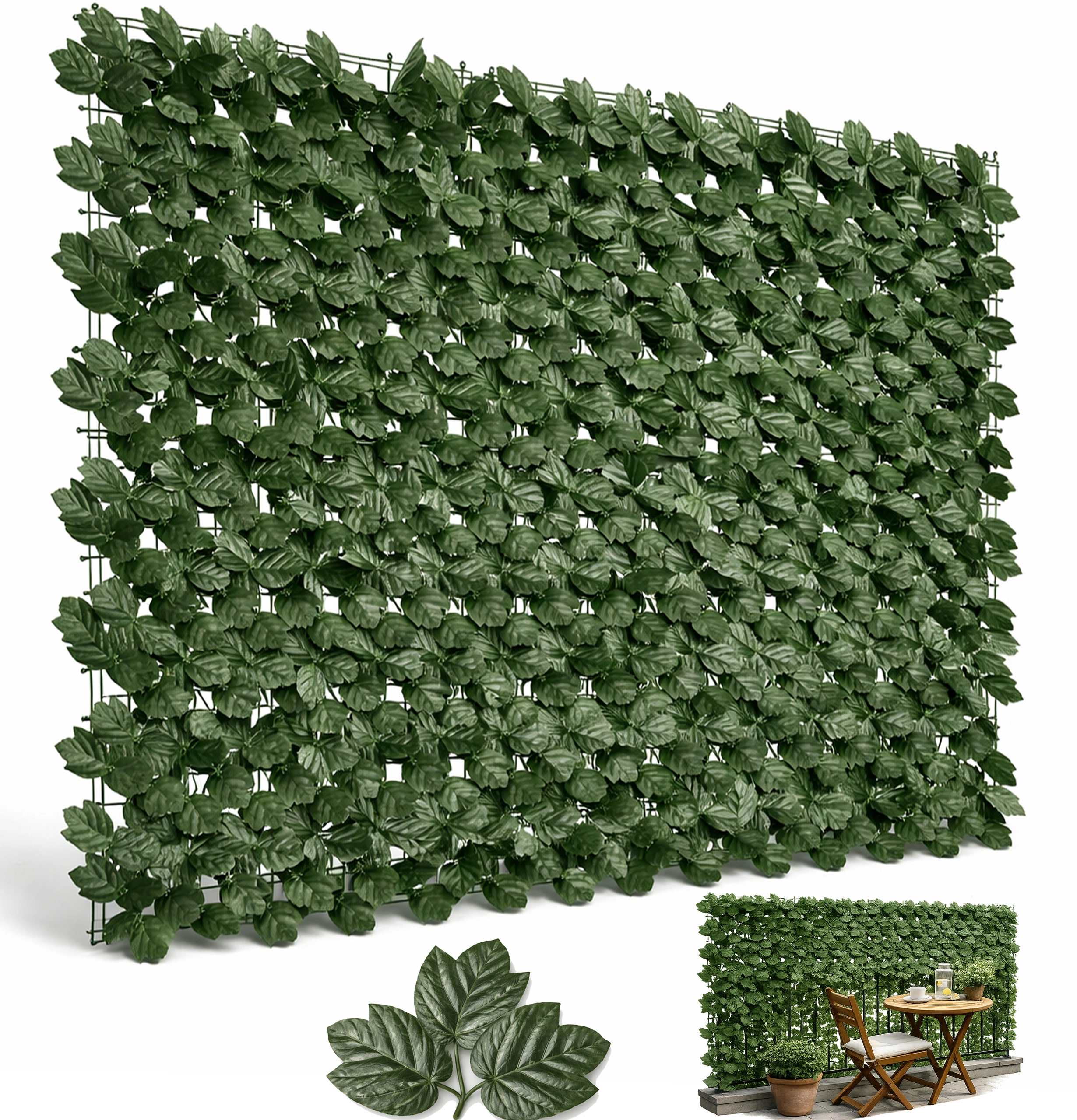 Creëer in een handomdraai privacy en een groene sfeer – deze kunstmatige klimop schutting met afmetingen van 1,5 × 3 m biedt dichte afdekking, realistische bladeren en eenvoudige installatie op hekken, balkons en muren. Het duurzame net met bladeren zorgt voor een directe verbetering van het uiterlijk en bescherming tegen inkijk zonder onderhoud.