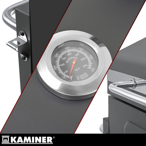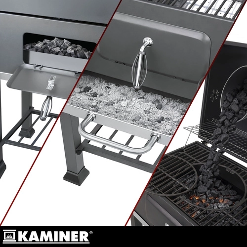 Ontdek de duurzame KAMINER houtskoolbarbecue, die dankzij het dik plaatstaal (1 mm) langer warmte vasthoudt en niet vervormt. Het gietijzeren 3-delige rooster (email) biedt stevige ondersteuning voor vlees; de centrale opening vereenvoudigt bediening en reiniging. Het deksel met geïntegreerde thermometer en het luchtstroomsysteem met schoorsteen maken nauwkeurige temperatuurregeling mogelijk zonder onnodig openen van het deksel.