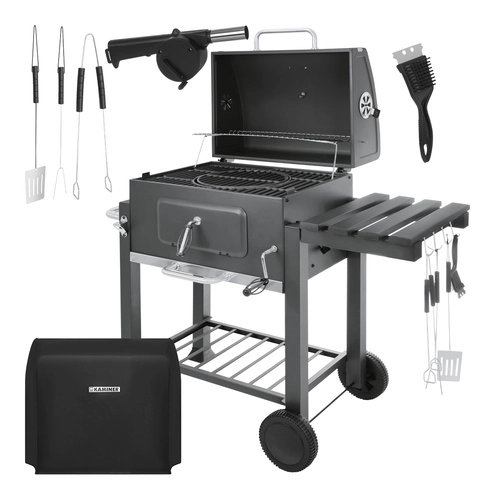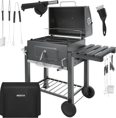 Met het slingermechanisme verhoog of verlaag je eenvoudig de vuurschaal en regel je de hitte zonder het voedsel te verplaatsen. De roestvrijstalen kolenbak verdraagt hogere temperaturen en reinigen beter, terwijl de uitschuifbare aslade het onderhoud versnelt. De praktische zijtafel, onderste plank en haken houden je gereedschap binnen handbereik. In de doos vind je ook een hoes, set BBQ-gereedschap, een handblaasbalg en een reinigingsborstel – voeg alleen houtskool toe en je kunt grillen.