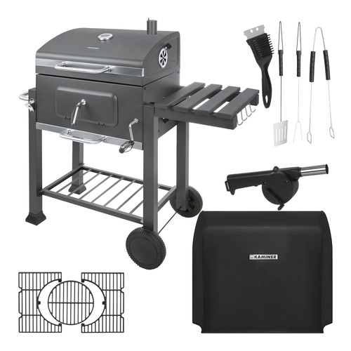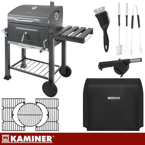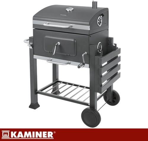 Robuuste KAMINER tuinbarbecue voor veeleisend grillen: gietijzeren, 3-delig geëmailleerd rooster met centrale opening, deksel met thermometer, hoogteverstelling van de vuurschaal met slinger en roestvrijstalen kolenbak voor stabiele temperatuur en eenvoudig reinigen. Het pakket wordt aangevuld met een verchroomd bovenrooster – warm rack, zijtafeltje, aslade en rijkelijke accessoires inclusief een beschermhoes.