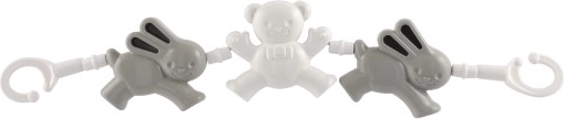 De kinderwagenketting met beertjes en konijntje is een ideale accessoire om je kind te vermaken. Dankzij de gevarieerde vormen en heldere kleuren helpt hij de fijne motoriek en zintuigen van je peuter te ontwikkelen. De eenvoudige bevestiging met haakjes aan beide uiteinden maakt snel en gemakkelijk vastmaken aan de kinderwagen of het ledikant mogelijk.