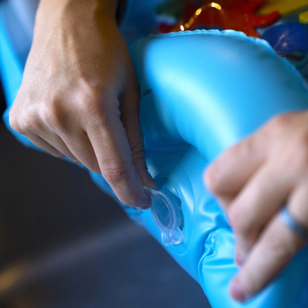 Het praktische ontwerp vergemakkelijkt dagelijks gebruik: de waterkamer vul je in een handomdraai, de rand blaas je op voor zachte demping en na het spelen laat je het water eenvoudig weglopen. Het gladde oppervlak is makkelijk schoon te maken, de mat vouwt compact op en gaat overal mee naartoe – op bezoek, op vakantie of gewoon in de woonkamer.