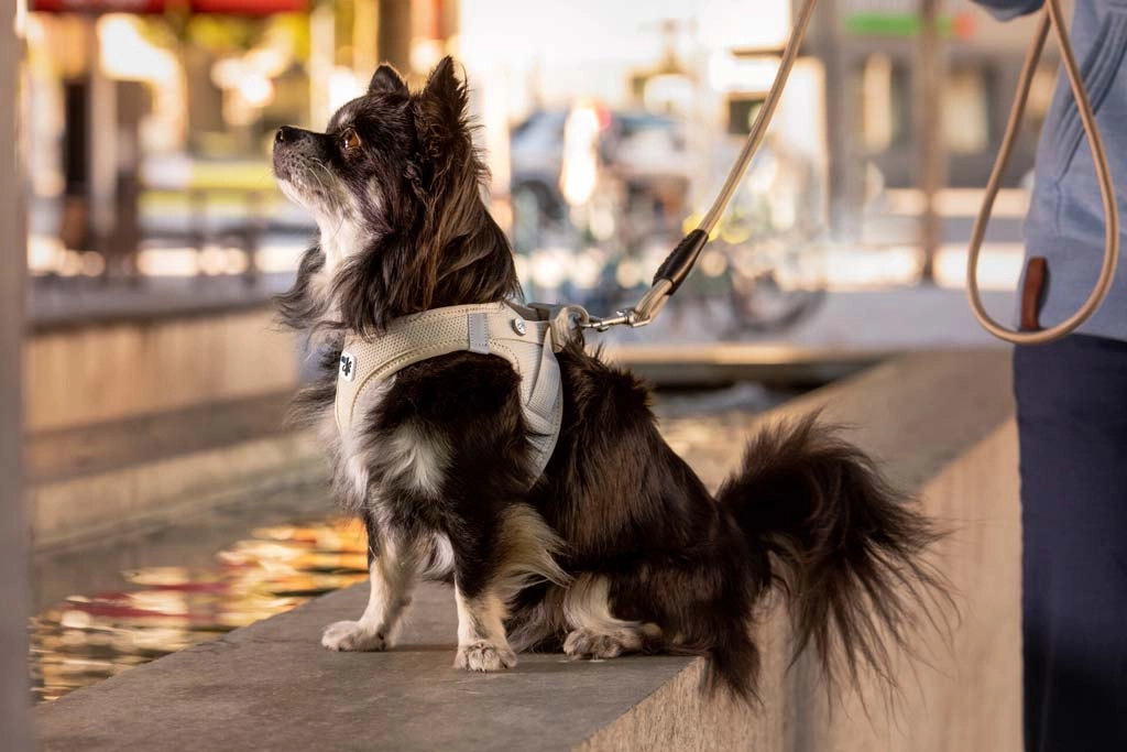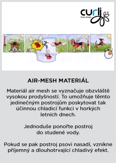 De ademende Air-Mesh stof is zacht, gepolsterd en biedt in de hitte een koelend effect – dompel het harnas vóór de wandeling even in koud water. Reflecterende elementen verhogen de zichtbaarheid in het donker en elastische naden die zich aan het lichaam van de hond aanpassen, ondersteunen de bewegingsvrijheid. Met de klittenbandsluiting stel je de maat eenvoudig af en de gepolsterde gesp beschermt de vacht tegen vastklemming.