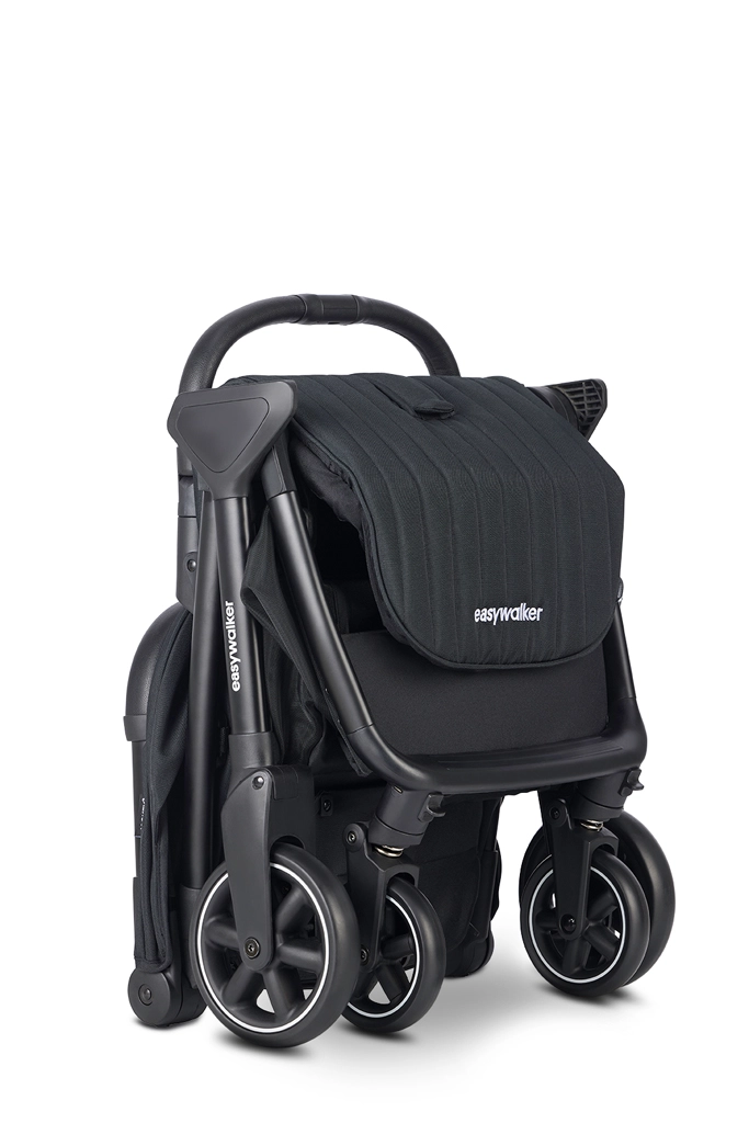 De lichte en compacte Easywalker Jackey2 buggy in de elegante kleur Midnight Black is ideaal voor dagelijks stadsgebruik en reizen. Hij biedt automatisch inklappen in 1 seconde, vering op alle wielen, een draagvermogen tot 22 kg en een volledig rechtopstaande tot volledig vlakke ligstand voor comfort en een gezonde lichaamshouding. De premium duurzame stof van gerecyclede PET is slijtvast en zacht aanvoelend.
