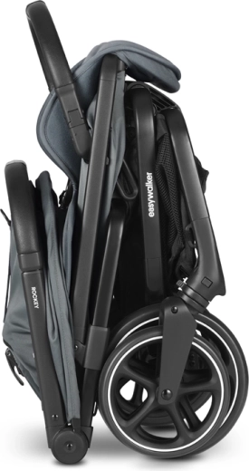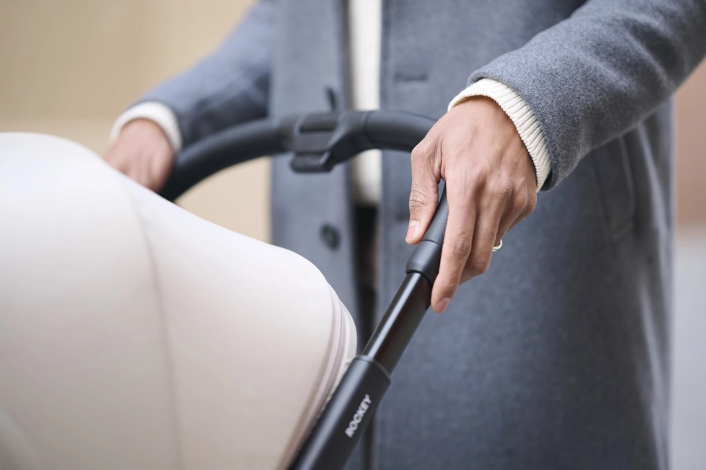 Snel en zorgeloos bedienen: de Rockey L klapt met één druk op de knop vanzelf in en uit, zodat je je handen vrij hebt voor je kind en je boodschappen.