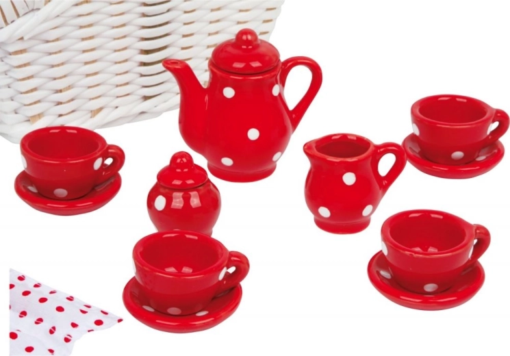 Bent u klaar voor een fantastische picknick met onze kindertheeset. Deze betoverende set bevat alles wat je nodig hebt – van een theepot, kopjes, schoteltjes tot een suikerpot en melkkannetje, allemaal gemaakt van duurzame keramiek met een vrolijk rood-witte stippenmotief. Alle 17 delen zijn zorgvuldig opgeborgen in een elegante gevlochten mand met stoffen servetten.