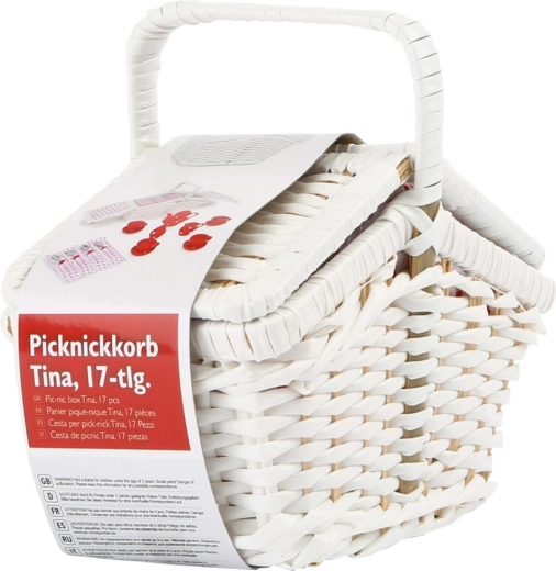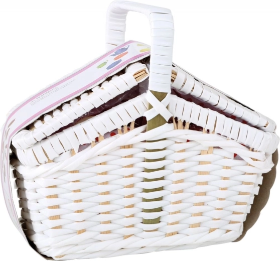 De witte gevlochten mand biedt opbergruimte voor de hele set, en de stevige constructie en decoratief element geven een authentiek picknickgevoel.