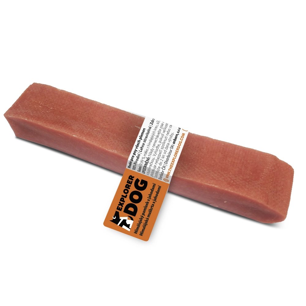 Himalayische kaassstaven worden gemaakt van melk van vrij grazende koeien en subtiel op smaak gebracht met aardbeienextract. Dankzij het traditionele proces van langdurig koken, persen en drogen in de rokerij gedurende 20–30 dagen krijgt de snack een uitzonderlijke hardheid en een zachte rooksmaak die honden uitnodigt tot lang en tevreden kauwen.